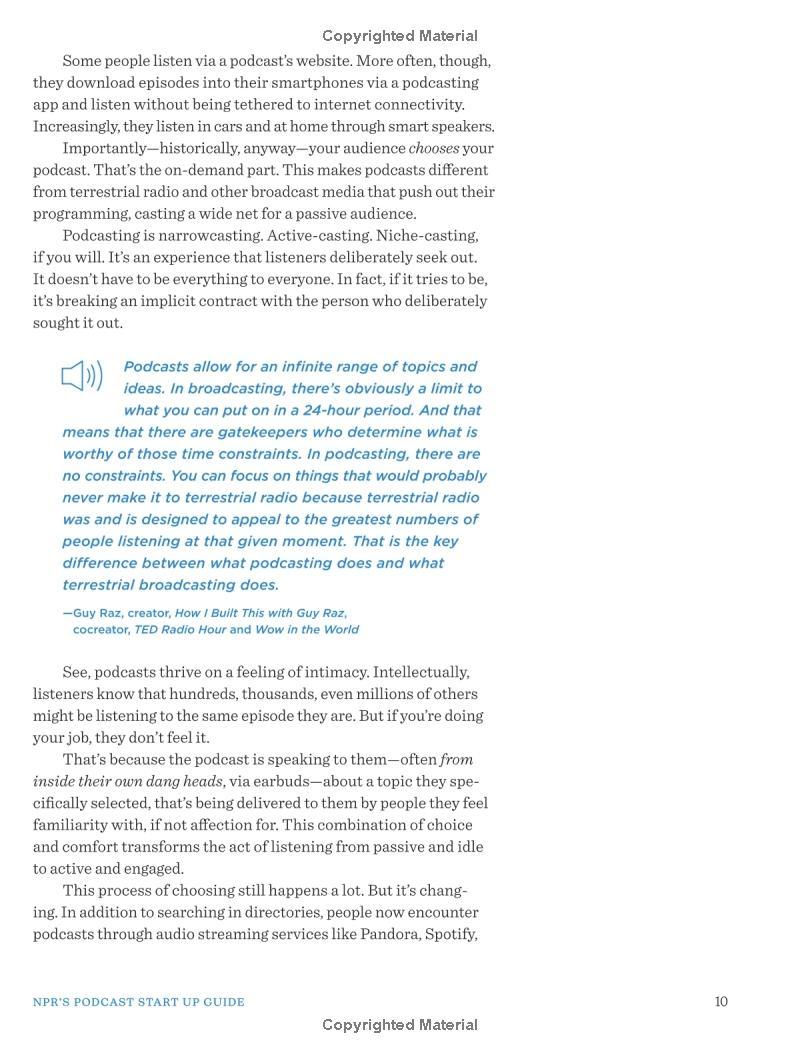 Podcasts are everywhere. Whoever you are, whatever you love, there's a podcast for you: political junkie, sports fan, foodie, pop culture lover, or science nerd. In a booming audio storytelling landscape, You should start a podcast has become the new You should start a blog. But any podcast enthusiast knows that, in such a vast and growing marketplace, quality varies hugely. The barrier to entry into podcast production--a mic and a laptop--is low, but the learning curve is steep. That's where NPR comes in.