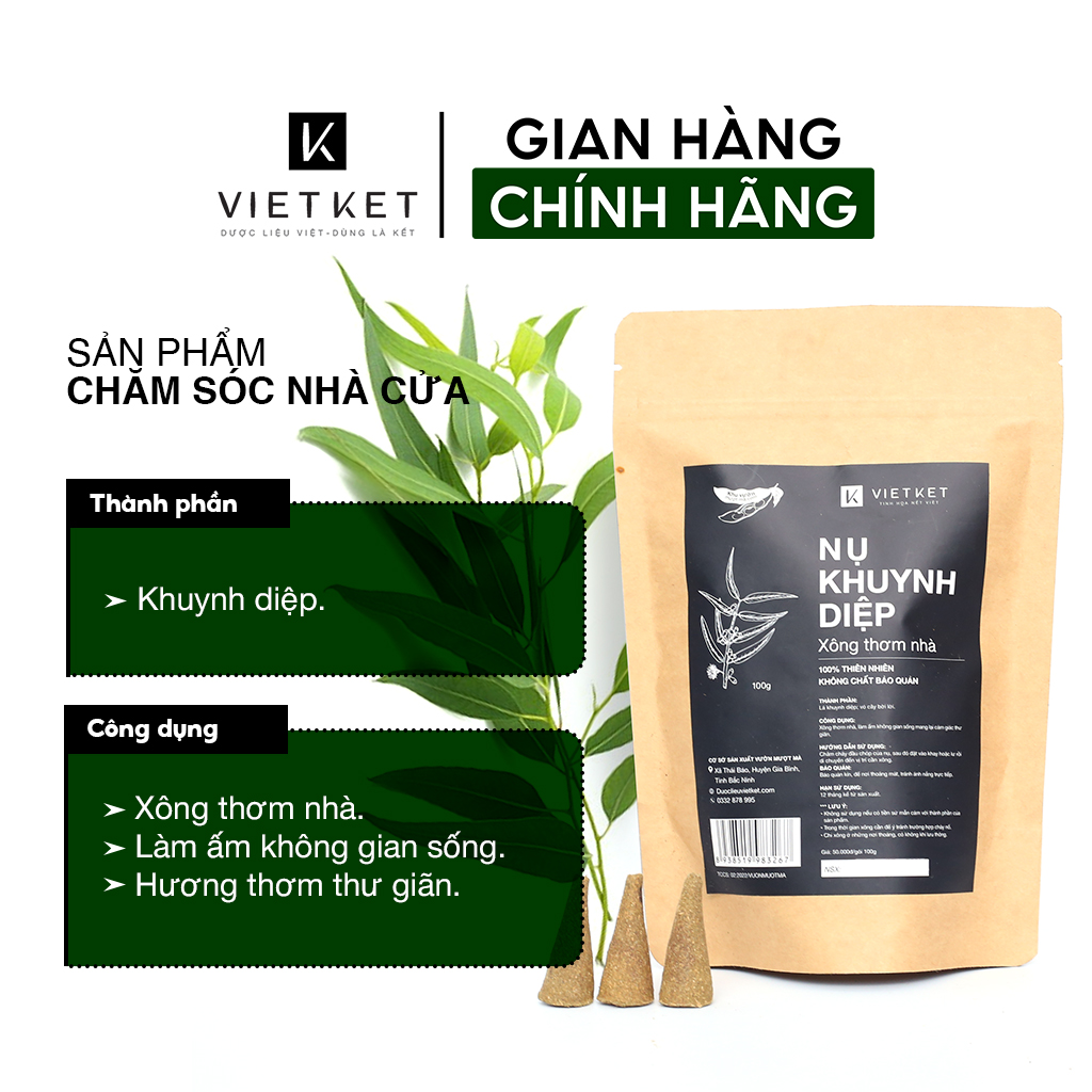 Nụ Khuynh Diệp VIETKET (VIỆT KẾT) 100g - Xông nhà tẩy uế, mùi thơm ký ức từ căn bếp nhà Giá: 50.000đ/ 1 gói Thành phần: Khuynh diệp,vỏ bời lời Công dụng: Xông nhà tẩy