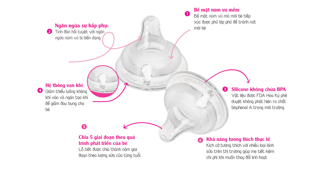 - Bề mặt núm vú mềm: Bề mặt núm vú mà môi bé tiếp xúc được phủ lớp phủ để tránh nứt môi bé. Silicone không chứa BPA: Vật liệu được FDA Hoa Kỳ phê duyệt không phát hiện ra chất bisphenol A trong môi trường
