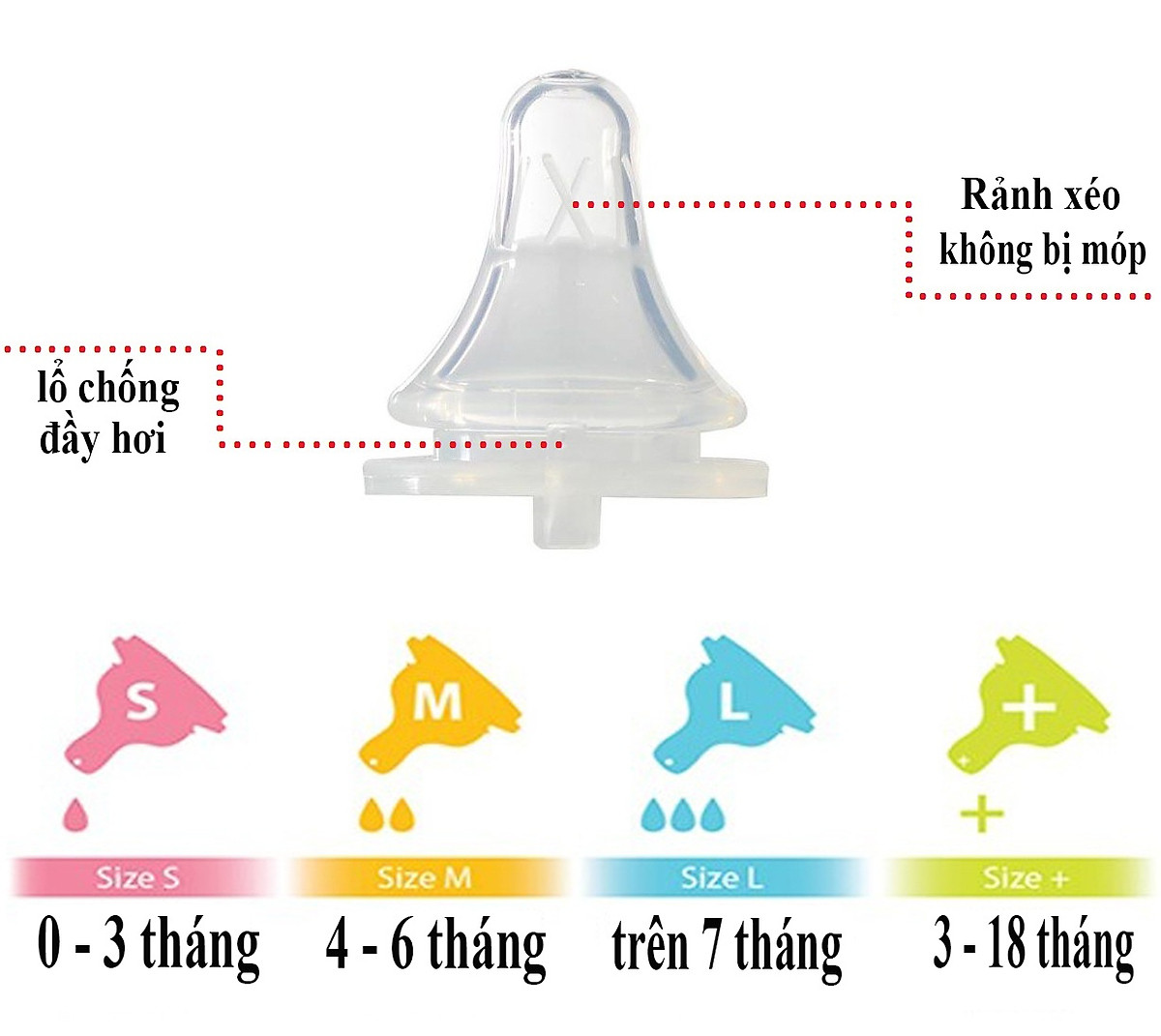 - Thiết kế có lỗ chống đầy hơi giúp giảm lượng khí dư khi bú, giúp sữa chảy đều hơn