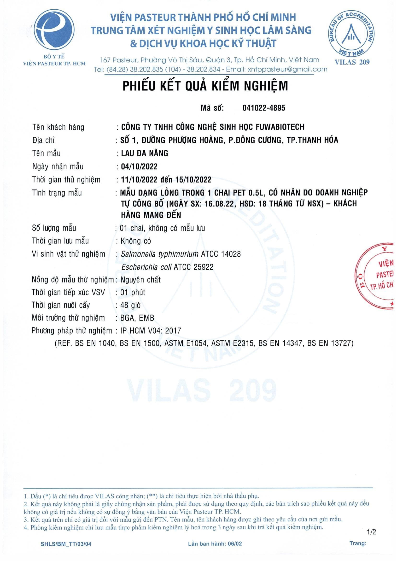 - Diệt 99% vi khuẩn trong 1 phút đã được Viện Pasteur chứng nhận.