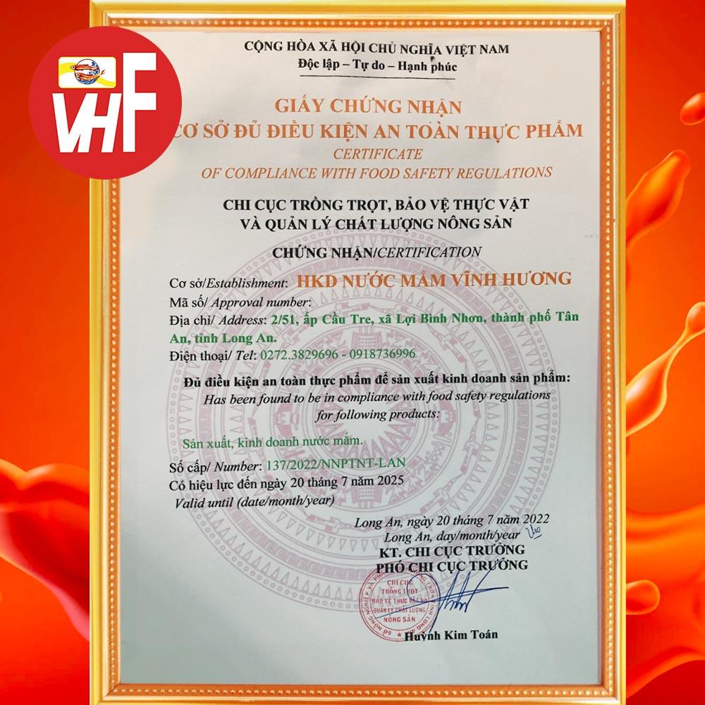 Nước Mắm Cá Đen Phan Thiết đạt chứng nhận tiêu chuẩn HACCP ( tiêu chuẩn VSATTP Châu Âu), OCOP 4 SAO (hạng mục tỉnh Bình Thuận), có giấy phép kiểm định của viện Pasteur HCM