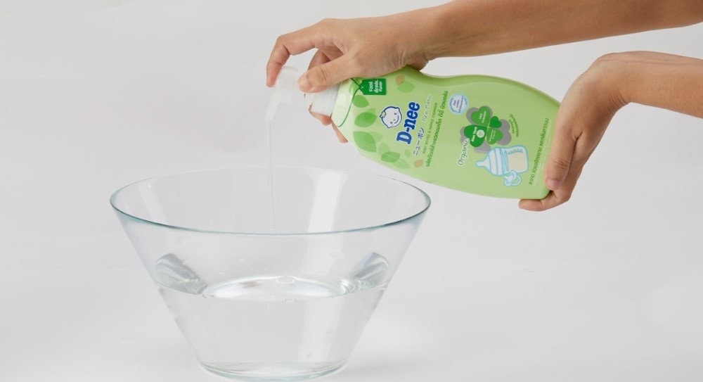 - Rửa bình sữa: Hoà 1/3 nắp hoặc 10ml dung dịch rửa bình sữa D-nee với 1 lít nước. Vệ sinh bình sữa với bàn chải.
