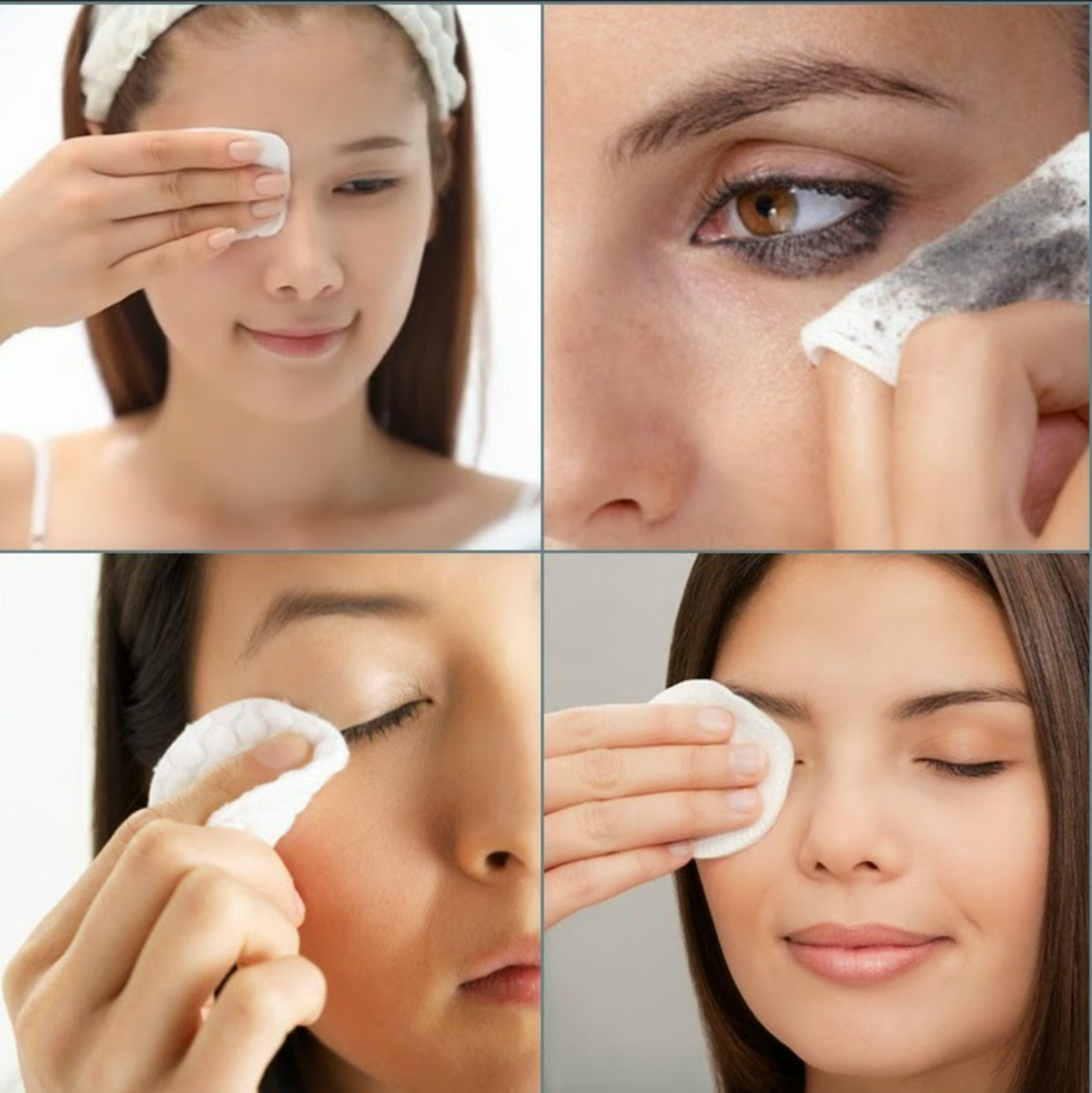 - Lấy một lượng tẩy trang cho lê bông tẩy trang rồi lau nhẹ nhàng theo chiều kim đồng hồ để làm trôi lớp trang điểm,bụi bẩn trên da mặt.