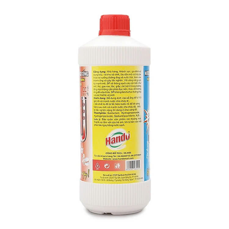 Thông sạch các cặn bẩn kẹt trong đường ốngNước thông tắc đường ống thoát nước Hando 1000ml xuất khẩugồm các hoạt chất đặc biệt có tác dụng làm mềm và phân huỷ các tạp chất