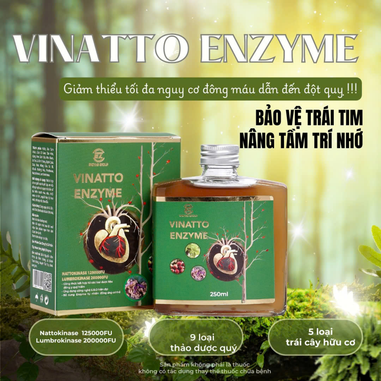 - Nước uống Vinatto Enzyme Là sản phẩm bảo vệ sức khỏe toàn diện, đặc biệt trong hỗ trợ tim mạch và phòng ngừa đột quỵ, tai biến mạch máu não. Với công thức enzyme tự nhiên tiên tiến, sản phẩm giúp tăng cường tiêu hóa, cải thiện chuyển hóa dinh dưỡng và giảm nguy cơ mắc các bệnh lý nghiêm trọng.