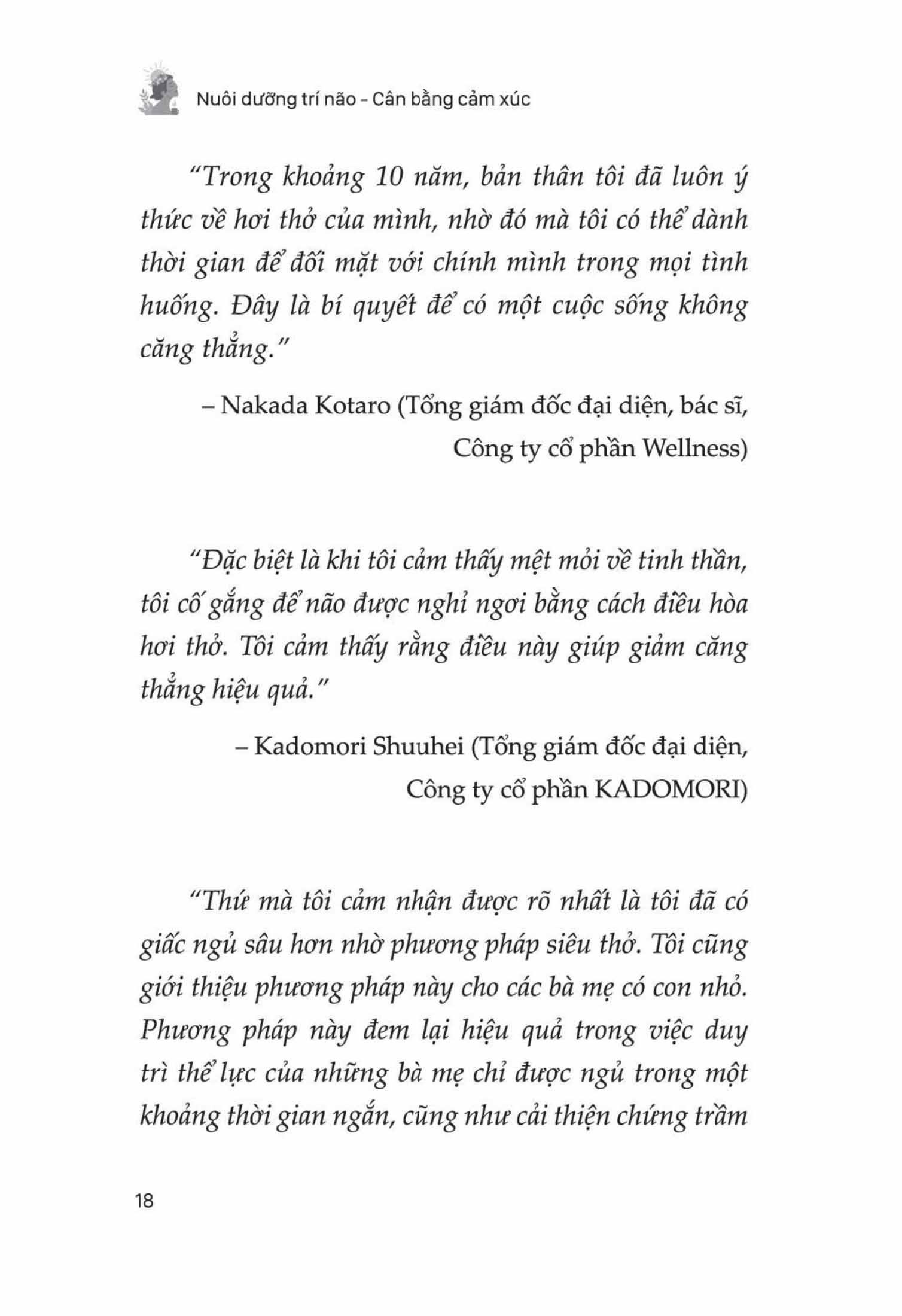Não là cơ quan quan trọng và tiêu thụ nhiều oxy nhất trong cơ thể con người. Nó đòi hỏi con người phải có sự tập trung cao độ và liên tục, sự quyết tâm và cảm hứng nhạy bén. Để não hoạt động hết công suất trong điều kiện như vậy, cần phải bơm một lượng lớn oxy lên não thông qua hô hấp nhằm hỗ trợ công suất cao đó. Với 10 phương pháp siêu thở kết hợp cùng với các động tác giãn cơ, cuốn sách “Nuôi dưỡng trí não - Cân bằng cảm xúc” sẽ trợ giúp bạn cải thiện tình trạng thiếu oxy và mệt mỏi não, từ đó, giải tỏa căng thẳng, nâng cao sự tập trung và duy trì hiệu suất tối đa trong cả một ngày làm việc. Nâng cao chất lượng của hơi thở là cách tốt nhất để chữa lành bản thân và thay đổi cuộc sống của bạn.