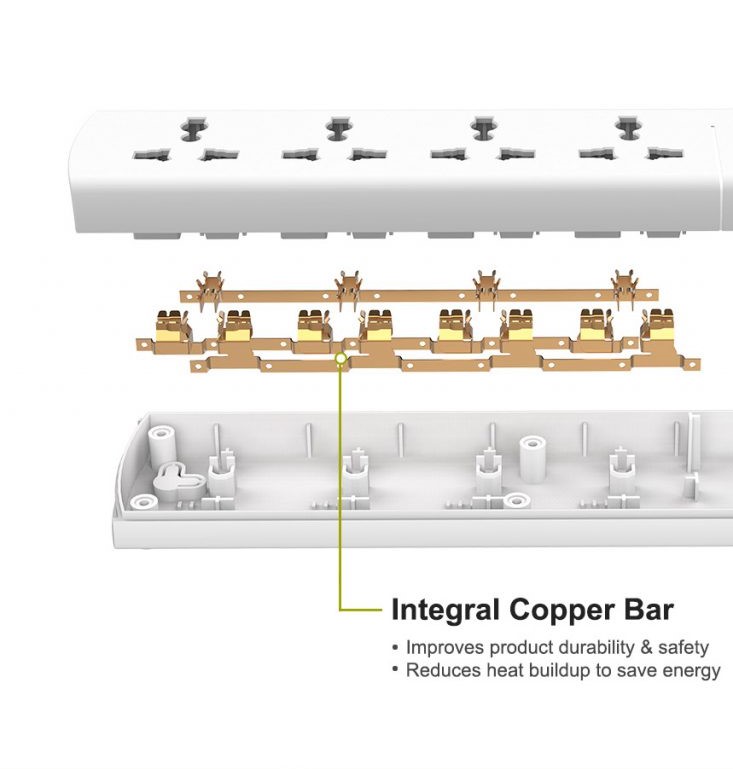Ổ cắm nối dài đa năng cao cấp Dây dẫn ĐỒNG NGUYÊN CHẤT, ĐÚNG TIẾT DIỆN 100% Bảo vệ quá tải bằng công tắc tự động (MINI CB) Tiếp điểm sử dụng nguyên liệu đồng