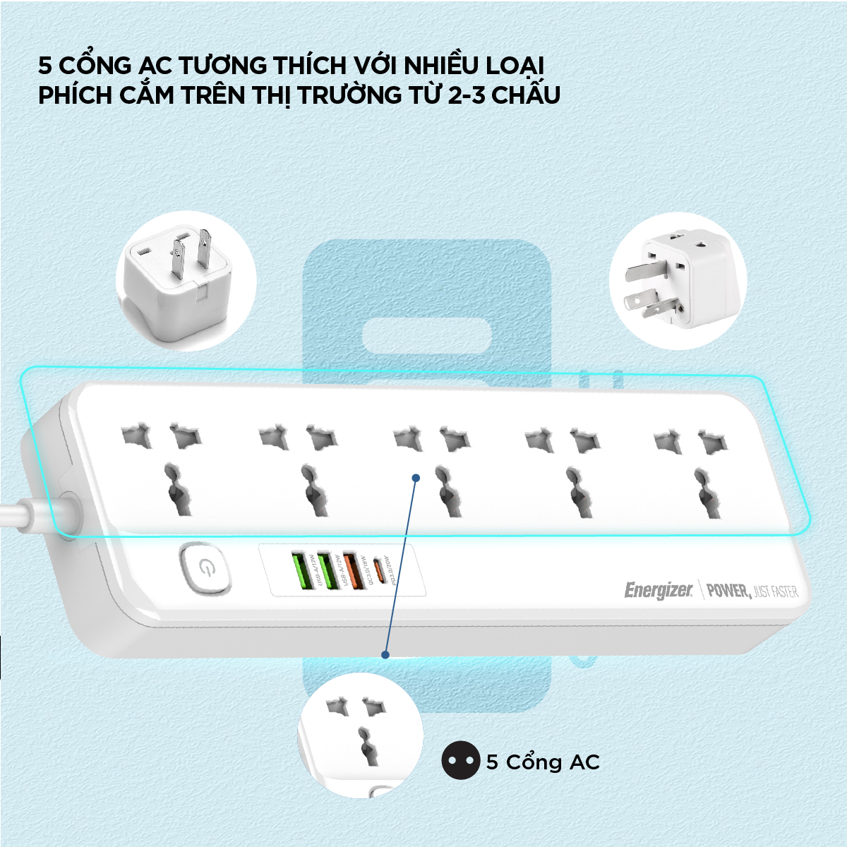 Thiết kế 5 cổng AC, 3 cổng USB-A, 1 cổng USB-C đảm bảo nhu cầu sử dụng cho nhiều thiết bị
