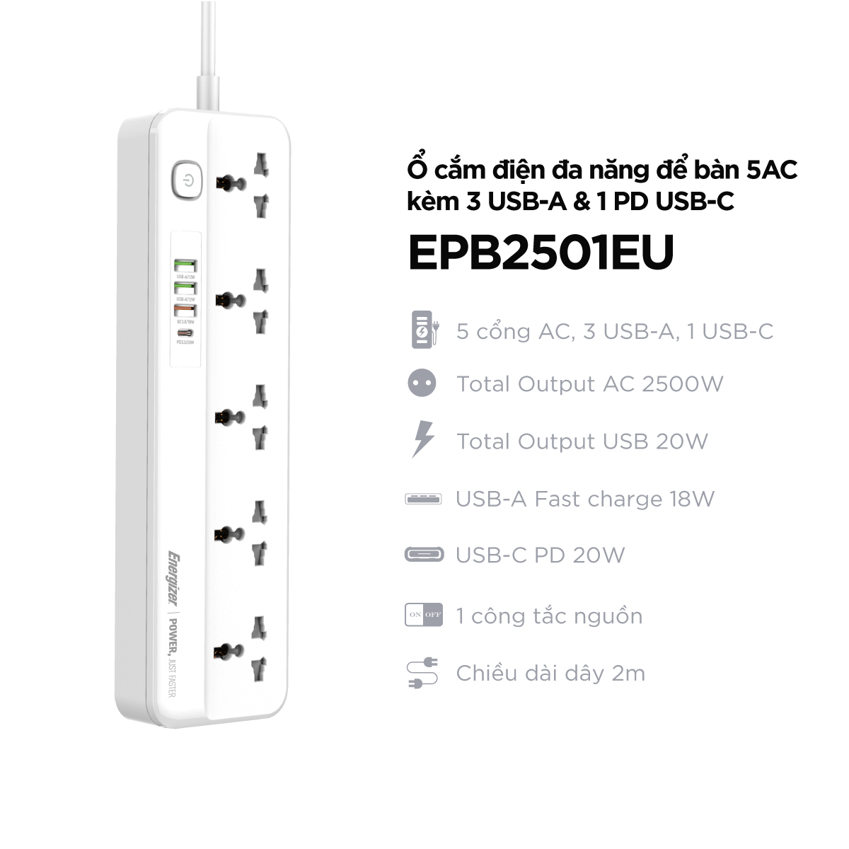 Ổ cắm đa năng 5m Model: OC02 4C/5M/10A Tìm sản phẩm tương tự Điện áp hoạt động tối đa: 250VAC Dòng điện ổ cắm tối đa: 10A Công suất ổ cắm tối đa: 2500W Dải