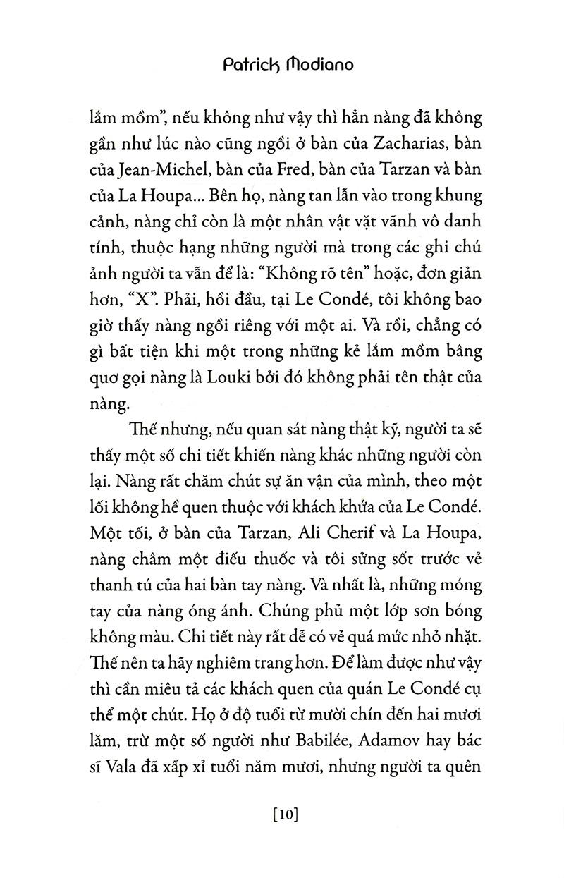 Hiếm tác giả nào khai thác di sản triết học của Guy Debord mềm mại như thế. Patrick Modiano đã biến lý tưởng "trôi dạt" của triết gia độc đáo ấy trở thành một tác phẩm cuốn hút, đặt những người có thật vào vòng hư ảo và đưa nhân vật hư ảo đến bến bờ thực tại theo một đường lối văn chương ảo diệu, ở quán cà phê của tuổi trẻ đã qua.
