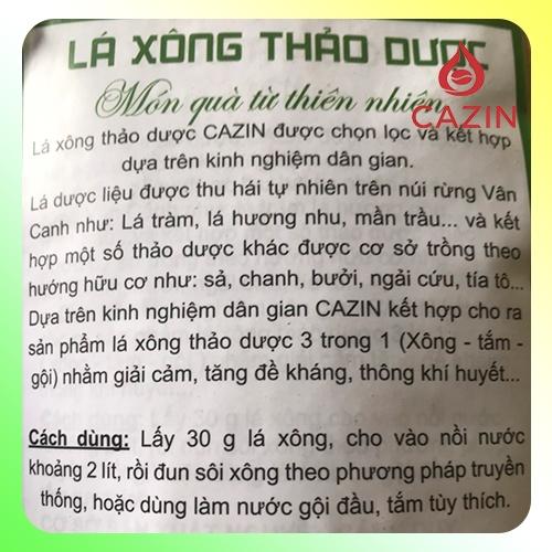 Lá xông thảo dược CaZin được chọn lọc và kết hợp dựa trên kinh nghiệm dân gian. Lá dược liệu được thu hái tự nhiên trên núi rừng Vân Canh như: lá tràm, lá hương nhu, mần trầ và kết hợp một số thảo dược khác được cơ sở trồng theo hướng hữu cơ như: sả , chanh, bưởi, ngải cứu, tía tô Dựa trên kinh nghiệm dân gian CaZin kết hợp cho ra sản phẩm lá xông thảo dược 3 trong 1 (Xông - tắm - gội) nhằm giải cảm, tăng đề kháng, thông khí huyế Cách dùng: Lấy 30g lá xông, cho vào nồi nước khoảng 2 lít, rồi đun sôi xông theo phương pháp truyền thống, hoặc dùng làm nước gội đầu, tắm tùy thích