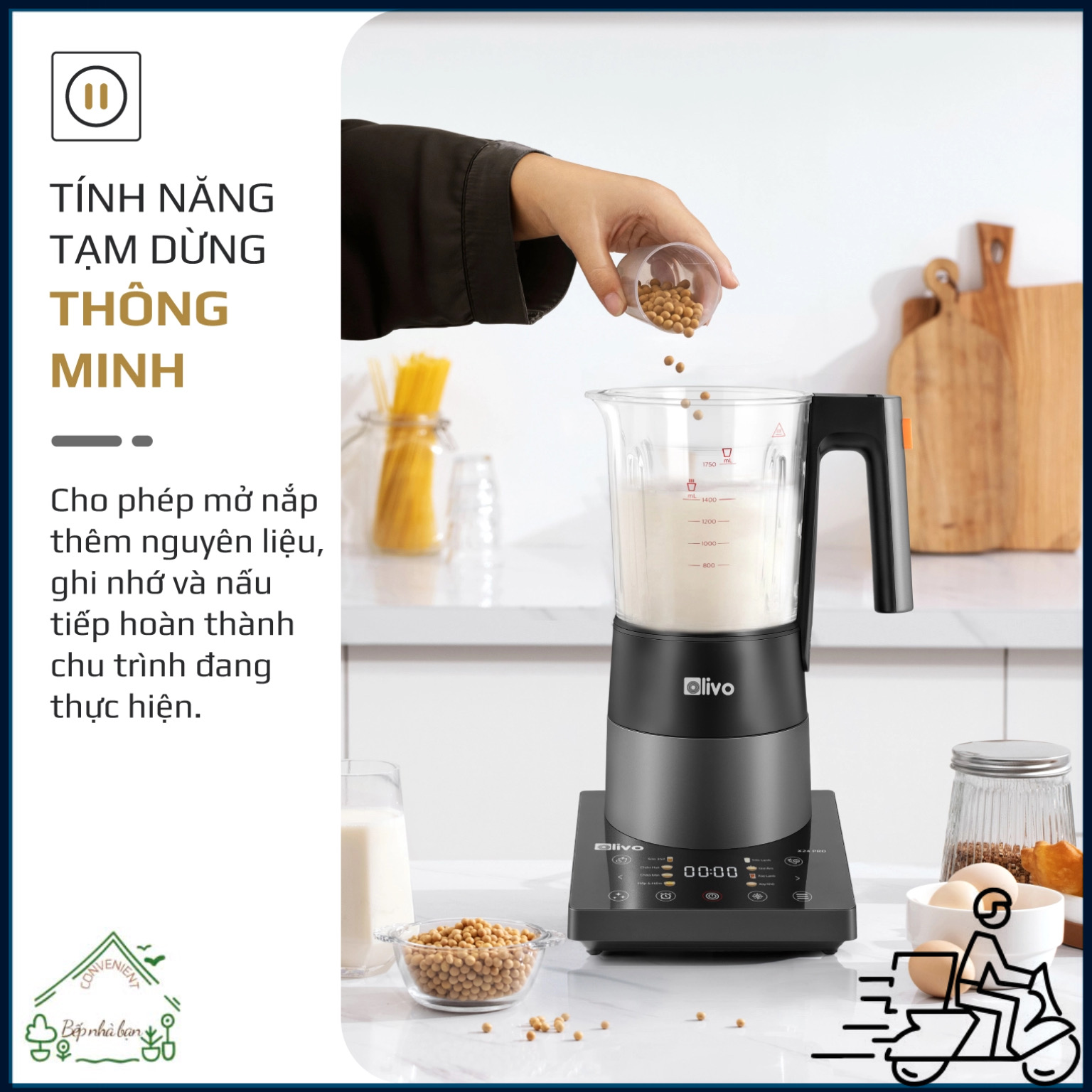 - Hẹn giờ Với chiếc máy này, bạn có thể xay và nấu nhiều loại sữa hạt khác nhau, rất tiện lợi và nhanh chóng. Ngoài ra còn có thể chế biến được nhiều món ngon khác, vô cùng hữu ích cho người nội trợ. Đặc biệt, các chế độ xay nấu tự động với thời gian và mức nhiệt được cài đặt sẵn, giúp bạn dễ dàng chế biến các món ngon mà không cần phải canh chỉnh, chỉ cần chuẩn bị nguyên liệu, cho vào cối và nhấn chọn chức năng tương ứng, bạn sẽ có ngay món ngon để thưởng thức. Ngoài các chế độ tự động, bạn cũng có thể sử dụng chế độ xay tùy chỉnh để làm được nhiều món hơn theo sở thích của mình. Công suất mạnh mẽ 2100W, mâm nhiệt gốm Công suất mạnh mẽ 2100W, mâm nhiệt gốm Máy làm sữa hạt Olivo X24 Pro được trang bị động cơ mạnh mẽ, công suất hoạt động đến 2100W. Trong đó, công suất xay 1300W và công suất nấu 800W. Với công suất này, máy có thể xay nấu được nhiều thực phẩm cùng một lúc, hoạt động hiệu quả và mạnh mẽ hơn, xay nhuyễn mịn và nấu chín đều nhanh một cách nhanh chóng. Đặc biệt, Olivo X24 Pro còn sử dụng mâm nhiệt gốm với nhiều ưu điểm vượt trội so với các loại mâm nhiệt thông thường như: khả năng làm nóng nhanh, chống dính, chống khê thực phẩm trong quá trình xay nấu, an toàn và độ bền cao. Máy làm sữa hạt Olivo X24 Pro hoạt động với hiệu suất cao nhưng khá êm ái, tạo ra độ ồn ở mức 68dB, giúp bạn tận hưởng quá trình xay nấu một cách yên tĩnh mà không bị ồn ào khó chịu. Cối thuỷ tinh bền chắc, dung tích 1.75L Cối thuỷ tinh bền chắc, dung tích 1.75L Máy làm sữa hạt Olivo X24 Pro có dung tích cối 1.75 lít khá lớn, phù hợp với nhu cầu sử dụng của gia đình từ 4-6 người. Với dung tích này, bạn có thể xay nấu được cùng lúc một lượng lớn thực phẩm, xay sinh tố, nấu sữa hạt đủ cho cả gia đình mà không cần chia nhỏ thành nhiều lần, tiết kiệm thời gian cũng như điện năng tiêu thụ. Cối xay bằng chất liệu thuỷ tinh Borosilicate cao cấp, kết cấu dày dặn, chịu được nhiệt độ cao đến 300 độ C và chịu được những va chạm trong quá trình sử dụng mà không bị nứt vỡ hay biến dạng. Chất liệu cối thuỷ tinh cũng đảm bảo an toàn với người dùng, không sản sinh chất có hại trong quá trình xay nấu ở nhiệt độ cao. Việc vệ sinh, làm sạch cối cũng dễ dàng và hiệu quả hơn. Lưỡi dao inox 304 8 cánh cao cấp Lưỡi dao inox 304 8 cánh cao cấp Máy làm sữa hạt Olivo X24 Pro trang bị lưỡi dao đặc biệt với cấu tạo 3 tầng 8 cánh, thiết kế răng cưa, xoay 360 độ cực kỳ linh hoạt. Chất liệu lưỡi dao inox 304 với độ sắc bén hoàn hảo, cùng với công suất xay mạnh mẽ, giúp xay thực phẩm siêu nhuyễn và mịn một cách nhanh chóng, dễ dàng. Chất liệu inox 304 cũng đảm bảo an toàn với thực phẩm, không bị gỉ sét, chống ăn mòn và độ bền cao. Điều khiển cảm ứng hiện đại, dễ sử dụng Điều khiển cảm ứng hiện đại, dễ sử dụng Máy làm sữa hạt Olivo X24 Pro trang bị điều khiển cảm ứng hiện đại, giao diện sử dụng tiếng Việt cực kỳ dễ dùng. Các biểu tượng và chú thích được hiển thị rõ ràng, trực quan, dễ nhìn, dễ hiểu. Người dùng chỉ cần chạm nhẹ vào biểu tượng trên bảng điều khiển để thực hiện các thao tác mong muốn. Hệ thống điều khiển cảm ứng còn tăng thêm tính thẩm mỹ cho sản phẩm và dễ dàng vệ sinh, lau chùi. Công nghệ chống tràn 3 lớp Công nghệ chống tràn 3 lớp Máy làm sữa hạt Olivo X24 Pro đem đến trải nghiệm sử dụng an toàn với 3 lớp chống tràn tuyệt đối. Bao gồm: Gioăng cao su 2 lớp: Gioăng cao su 2 lớp giúp nắp cối xay đóng khít với thân cối, ngăn chặn bọt khí hoặc chất lỏng trào ra ngoài. Tầng giữa tạo lực cản: Tầng giữa tạo lực cản ngăn chặn dòng nguyên liệu trào ra ngoài. Van chống trào ngoài cùng: Van chống trào ngoài cùng khóa dòng chuyển động để ngăn chống trào tuyệt đối. Nhờ có công nghệ chống trào tuyệt đối, bạn có thể yên tâm nấu các món ăn yêu thích mà không lo bị trào máy, gây mất vệ sinh và an toàn. Với công nghệ chống trào tuyệt đối, bạn có thể yên tâm nấu các món như sữa hạt, cháo, súp… mà không lo bị trào máy, gây mất vệ sinh và an toàn. Nhiều tiện ích tăng trải nghiệm người dùng Nhiều tiện ích tăng trải nghiệm người dùng Hẹn giờ đến 12 tiếng Máy làm sữa hạt Olivo X24 Pro có tính năng hẹn giờ đến 12 tiếng. Bạn có thể cho nguyên liệu vào cối vào tối hôm nay, và cài đặt hẹn giờ để máy tự động khởi động vào sáng hôm sau. Sau đó, nguyên liệu sẽ được xay hoặc nấu sẵn sàng cho bữa sáng mà bạn không cần phải dậy sớm. Chế độ tự vệ sinh Sau khi sử dụng, bạn chỉ cần cho một ít nước vào cối và chọn nút chức năng Vệ sinh máy. Toàn bộ lòng cối và lưỡi dao sẽ được làm sạch bằng nước nóng ở nhiệt độ cao, không chỉ loại bỏ cặn thức ăn, dầu mỡ mà còn khử khuẩn một cách hiệu quả. Tiết kiệm được nhiều thờ