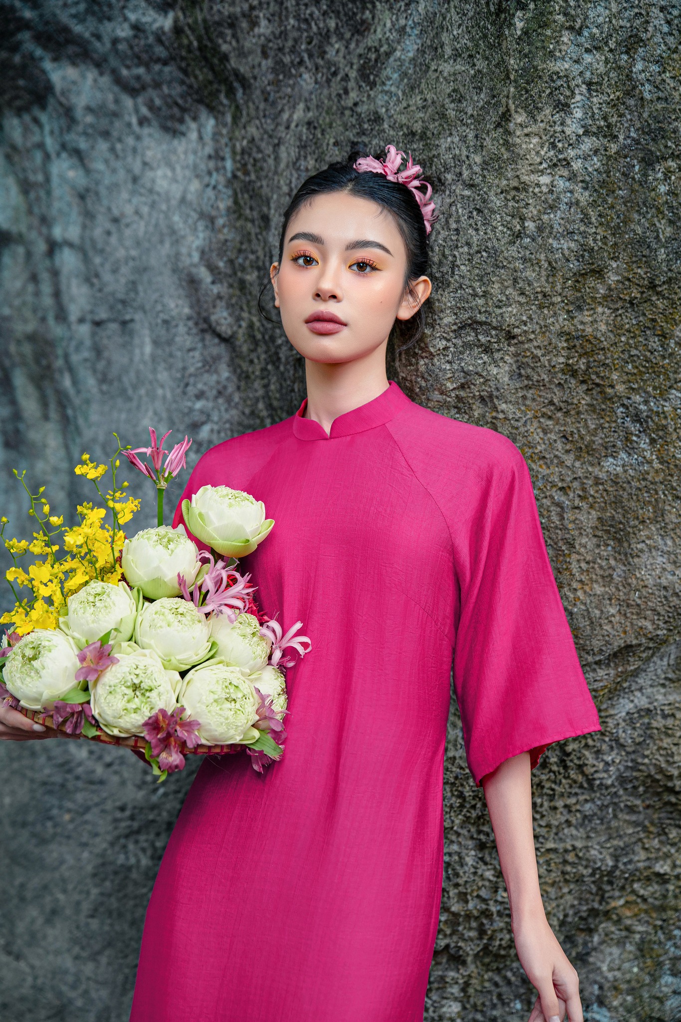 Áo dài form suông đỏ đô may bằng chất liệu lụa gấm loại 1 kết hoa và chim, tay lỡ loe, quần lụa hồng nhạt