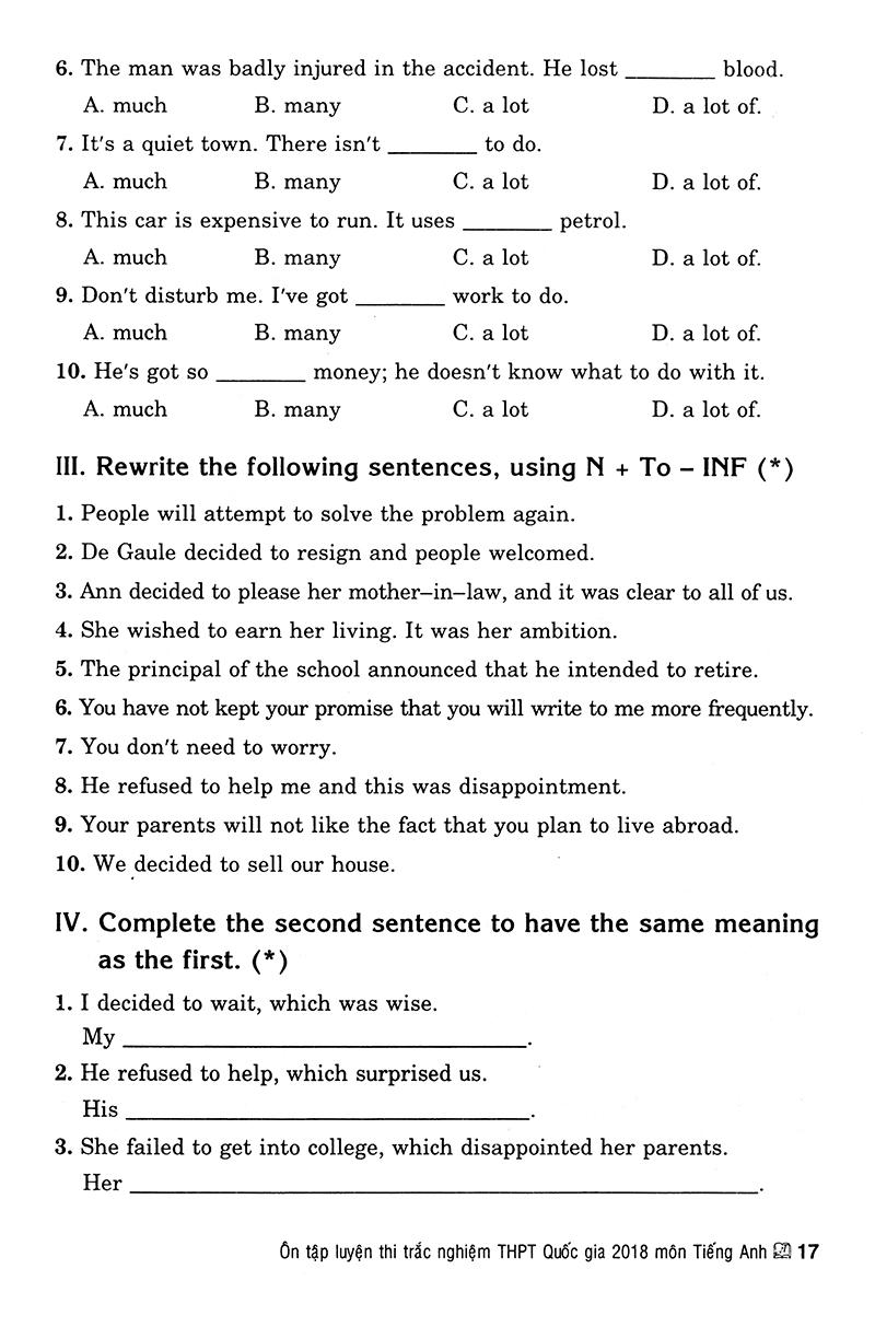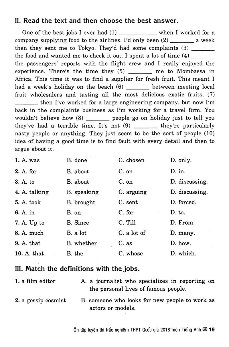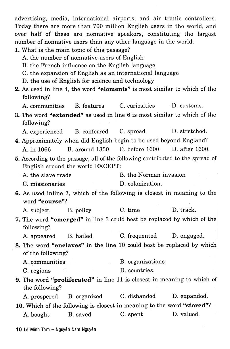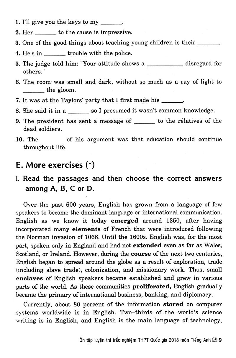 Cấu trúc đề thi và bài tập đều được chọn lọc theo tiêu chí: sát với đề thi nhất có thể. Lời giải chi tiết cũng được cải tiến, giúp các em hiểu sâu vấn đề, các từ vựng trong bài đều được giải nghĩa và cung cấp ví dụ cùng lời dịch. Như vậy, ngoài việc hiểu từ ra, các em còn biết được cách dùng từ - một yếu tố vô cùng hữu ích để làm tốt phần tự luận hoàn thiện câu và viết câu.