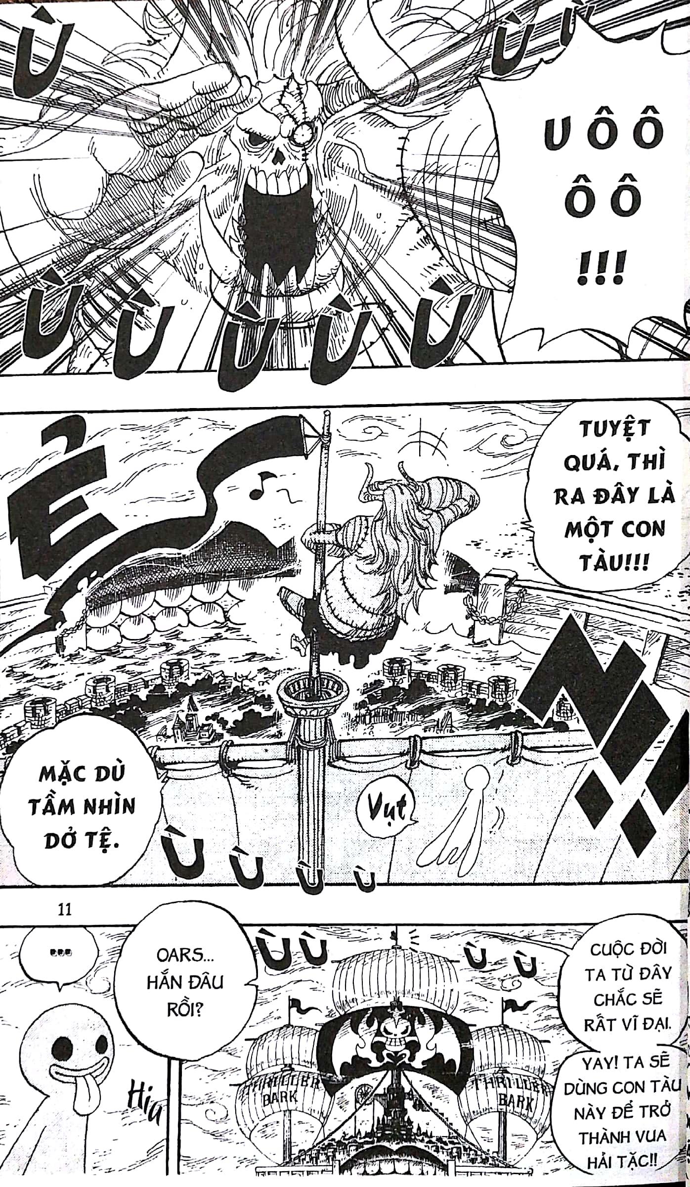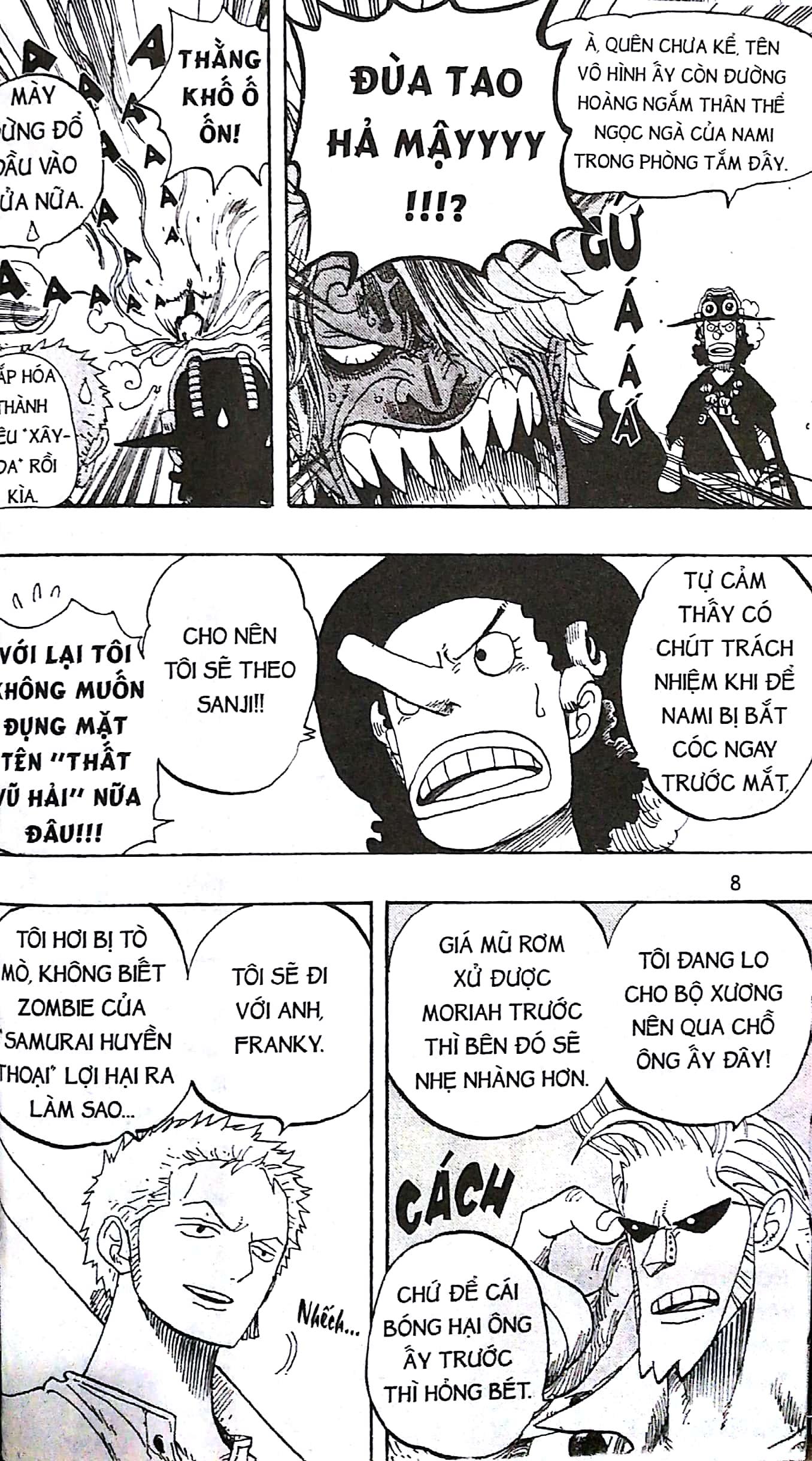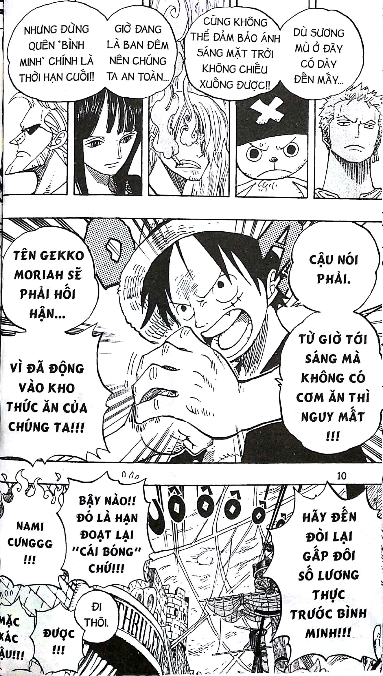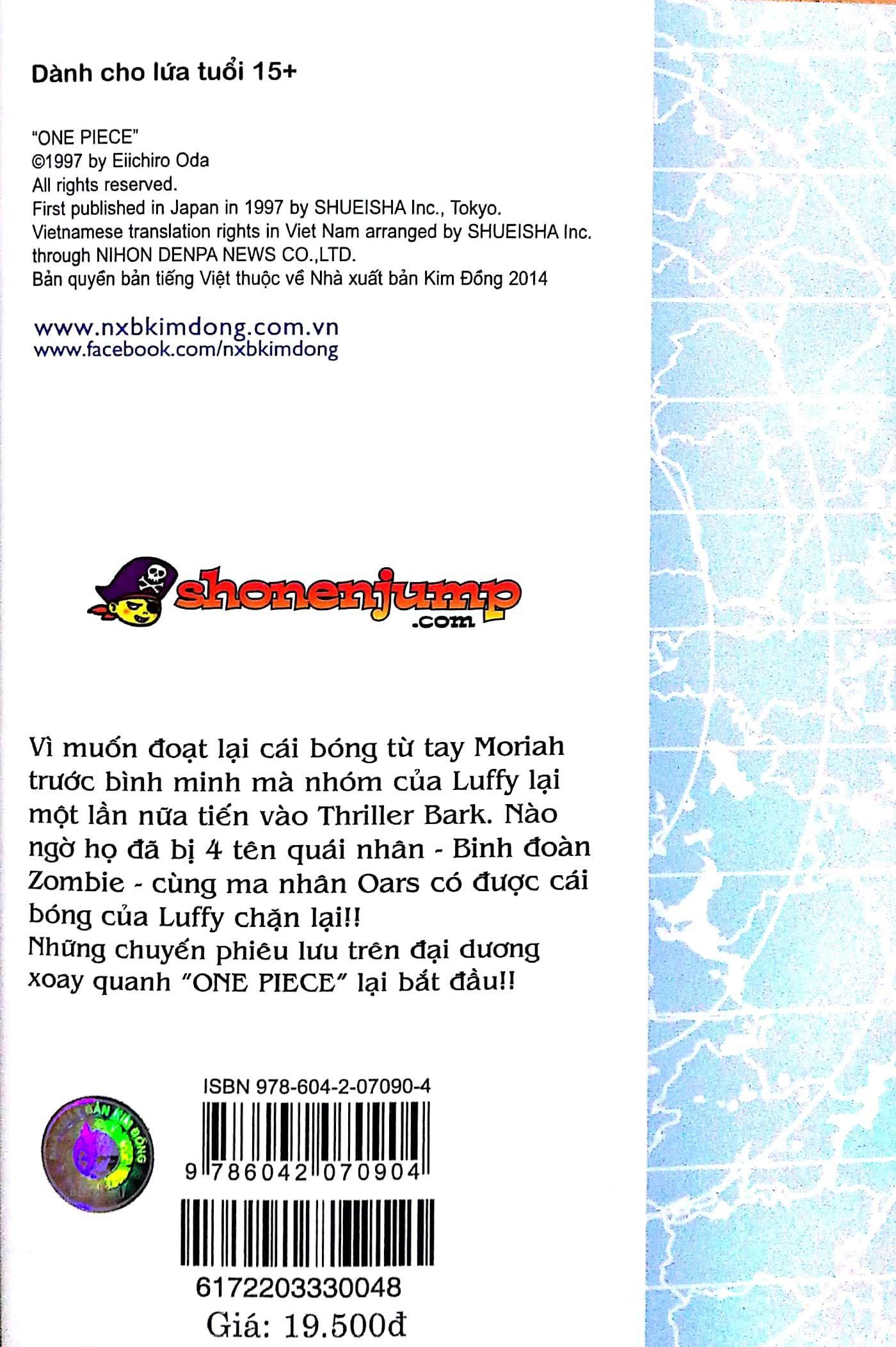 Vì muốn đoạt lại cái bóng từ tay Moriah trước bình minh mà nhóm của Luffy lại một lần nữa tiến vào Thriller Bark. Nào ngờ họ đã bị 4 tên quái nhân - Binh đoàn Zombie - cùng ma nhân Oars có được cái bóng của Luffy chặn lại!
