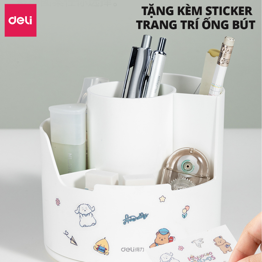 ✨Ống Bút Xoay 360 Độ Deli - Hộp Đựng Bút Tròn Nhiều Ngăn Để Bàn Tích Hợp Giá Đỡ Điện Thoại - Tặng Kèm Sticker