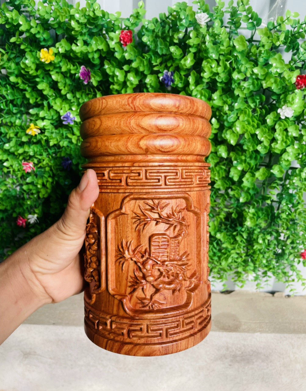 ✨Ống cắm bút trạm khắc thân bút nhiều tích hoa văn khác nhău bằng gô hương đá kt cao 20×12×12cm