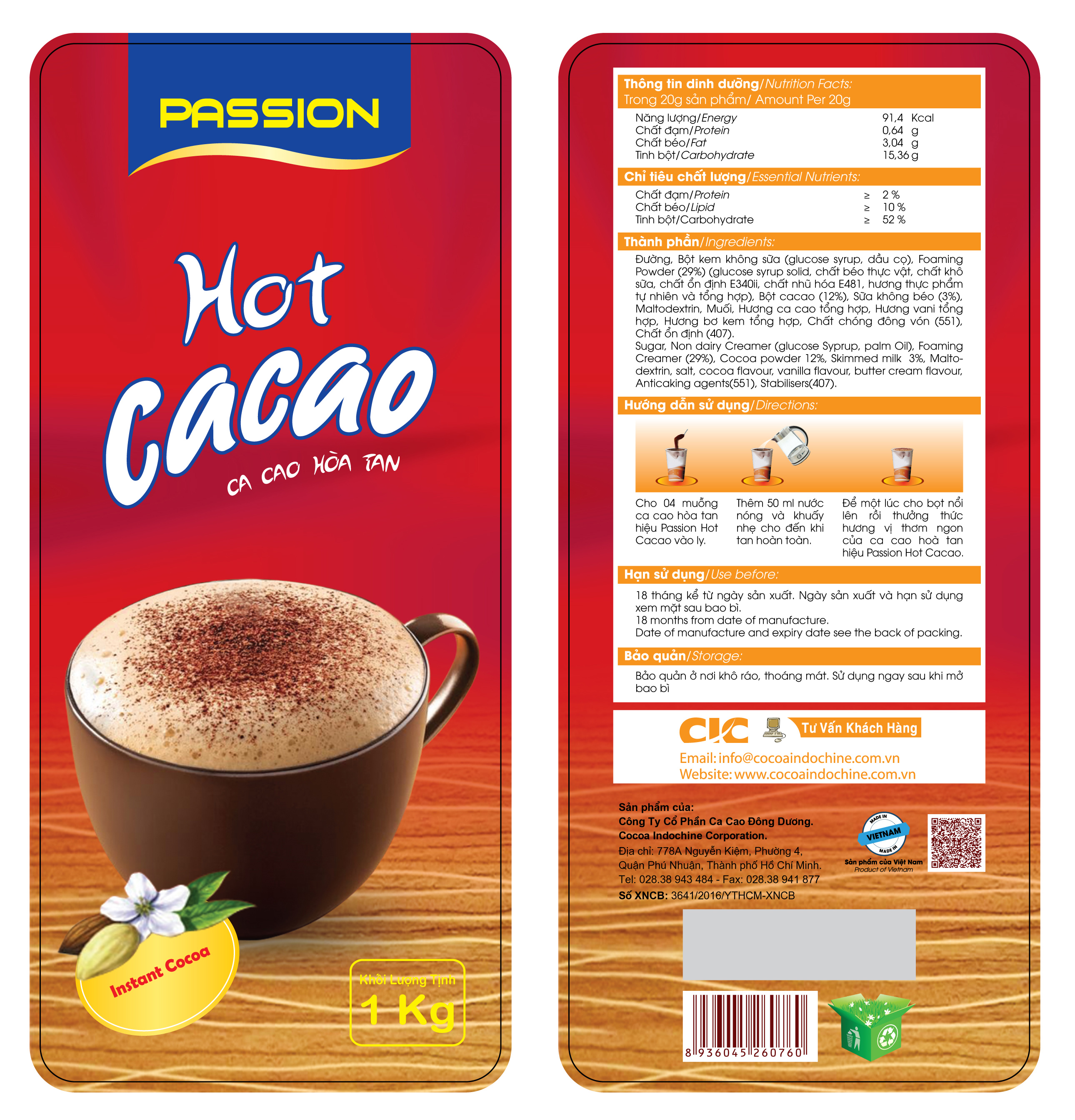 - Hướng dẫn sử dụng: Đổ một gói ca cao hiệu Passion Hot Cacao vào ly. Thêm 50 ml nước nóng và khuấy nhẹ cho đến khi tan hoàn toàn. Để một lúc cho bọt nổi lên rồi thưởng thức hương vị thơm ngon của ca cao hiệu Passion Hot Cacao.