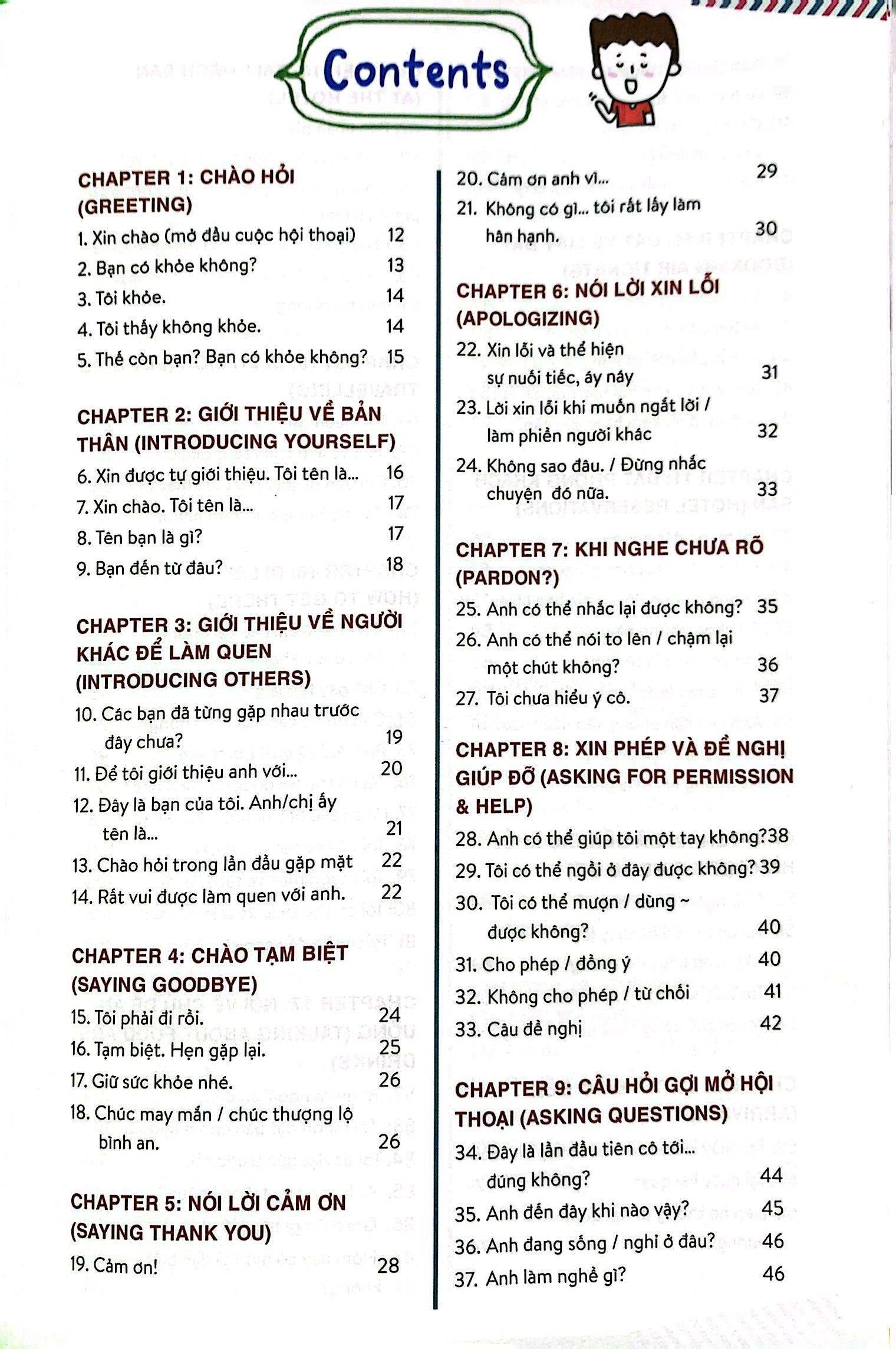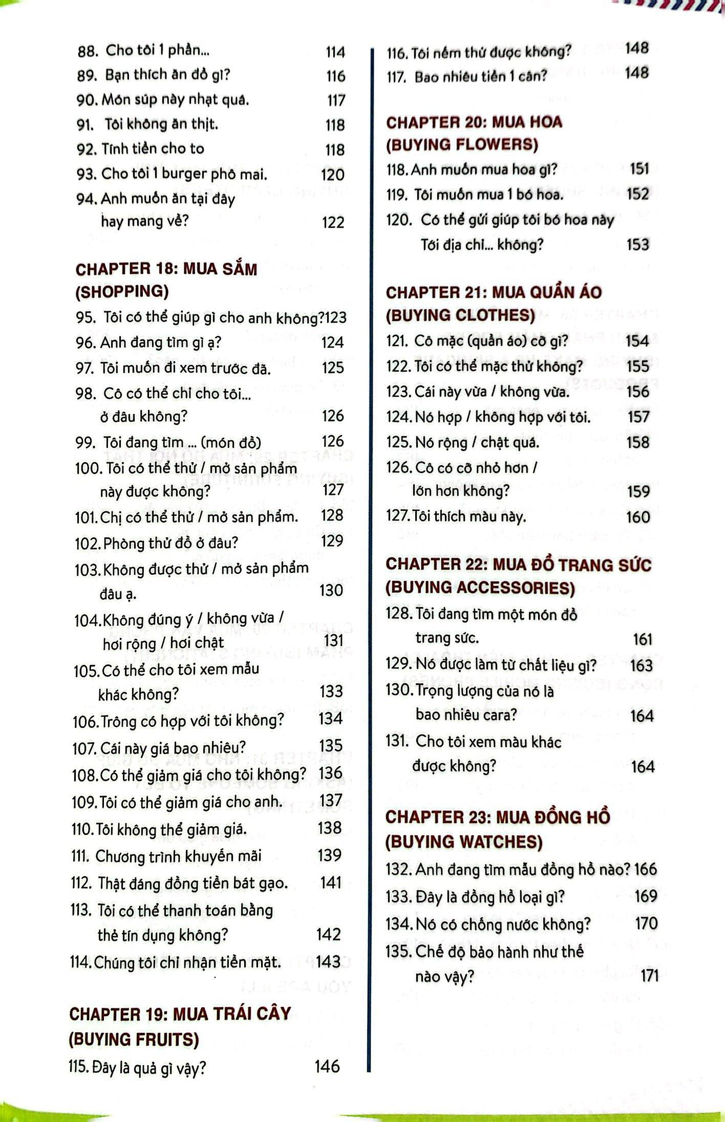 Đúng như tên gọi “Ăn dặm tiếng Anh” của bộ sách, Perfect English Conversation tập trung vào các đoạn hội thoại đơn giản dành cho người mới bắt đầu làm quen với tiếng Anh. Cuốn sách bao gồm 307 bài học, được chia thành 25 chủ điểm gần gũi, quen thuộc với cuộc sống thường ngày như: cách chào hỏi, cách hỏi đường, trao đổi khi đi mua sắm và bán hàng, chia sẻ về sở thích và công việc, thậm chí là cả ngỏ lời làm quen và cầu hôn. Với cách tiếp cận đơn giản và dễ hiểu, kèm hình minh họa sinh động, cuốn sách sẽ giúp người học dễ dàng nắm bắt được các mẫu câu hội thoại thông dụng để có thể nhanh chóng học tập và ứng dụng vào cuộc sống.