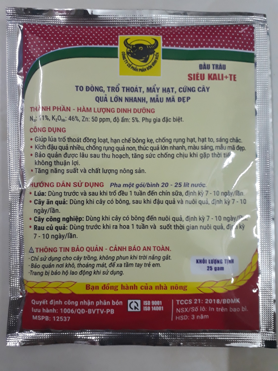 - Công dụng: Phân bón đầu trâu SIÊU KALI + TE giúp lúa trỗ thoát đồng loạt, kích đậu quả nhiều, bảo quản được lâu sau thu hoạch, tăng năng suất và chất lượng nông sản