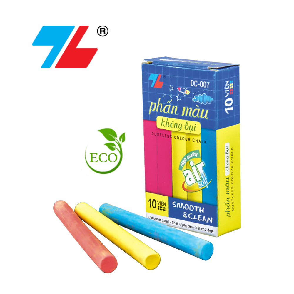 Phấn màu không bụi được sản xuất từ nguyên liệu chính là Cacbonnat Canxi chất lượng cao với công thức cải tiến mới. Phấn viết êm tay, rõ ràng, độ mịn cao, màu sắc đẹp,