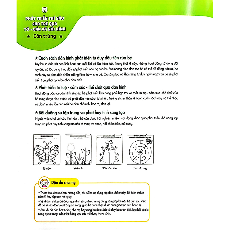 Thông qua trò chơi tô - dán và nối hình, bé sẽ được làm quen với thế giới các loài côn trùng nhỏ bé, đáng yêu và vô cùng đa dạng cùng với tập tính, đặc điểm của từng loài như kiến kiếm ăn theo đàn, nhện giăng tơ bắt mồi, ong chăm chỉ làm mật, ốc sên màu sặc sỡ, bọ rùa cánh cứng xinh