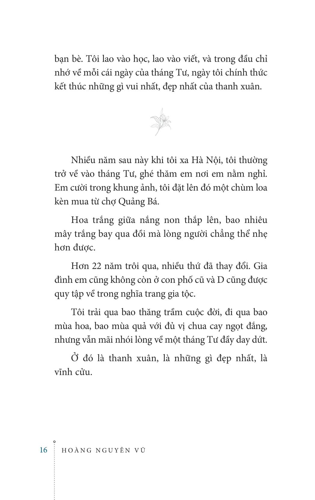 Thông qua những trang viết rất đẹp của Hoàng Nguyên Vũ, ta có thể cảm nhận được rằng không phải cái gì thân thuộc mình cũng sẽ giữ lại được mãi trong đời. Như hoa, thân thuộc đấy nhưng chỉ giữ lại mùi hương trong tâm trí mình, còn những cánh vàng kia thì hữu hạn, cũng tàn tạ, cũng bay theo gió, theo mây.