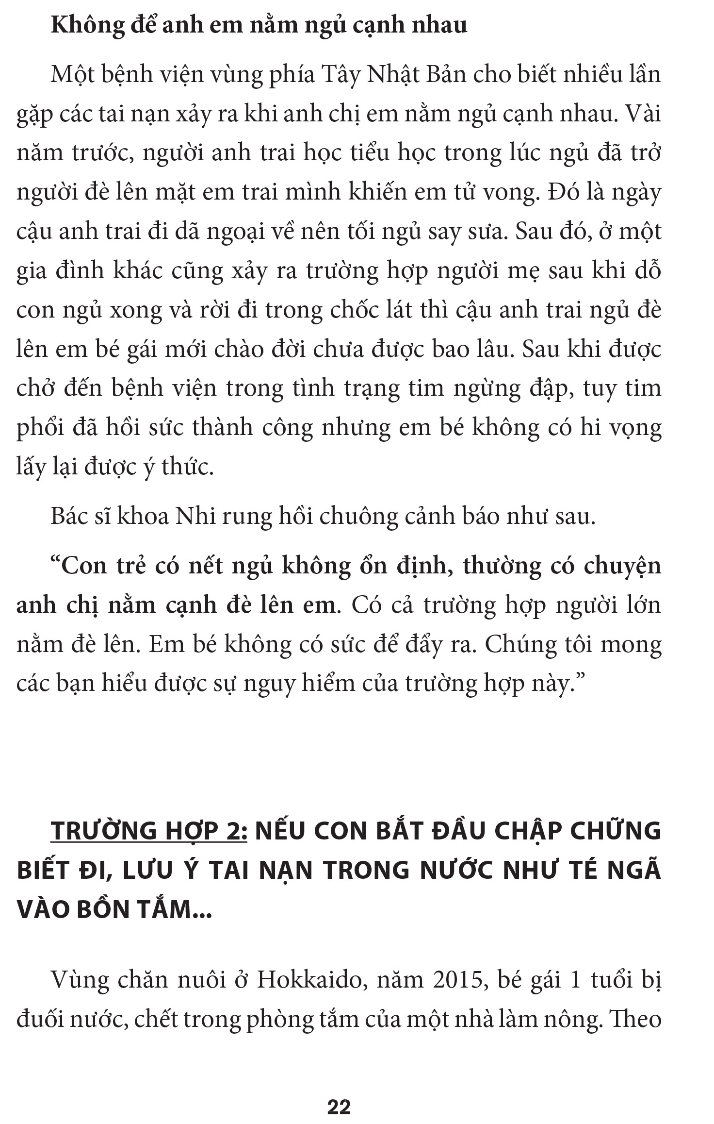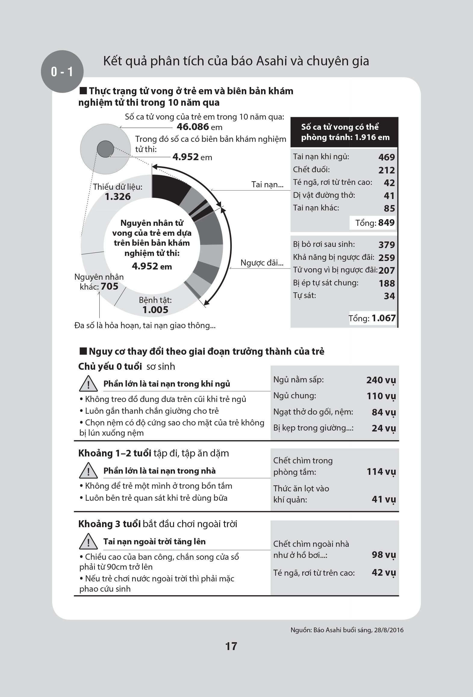 Được biên tập lại từ loạt phóng sự ấy, Phòng tránh tai nạn ở trẻ nhỏ đề cập đến các nguy cơ tai nạn khác nhau theo giai đoạn trưởng thành của trẻ, từ đó đưa ra các biện pháp phòng tránh có thể áp dụng tại nhà, tại trường học, và trên toàn xã hội.