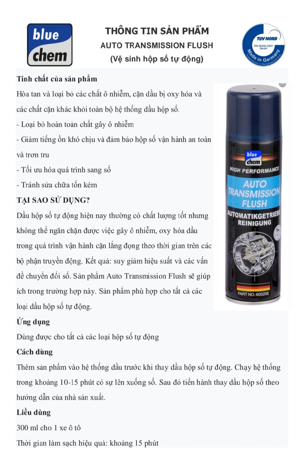 Phụ gia nhớt vệ sinh hộp số tự động cho xe ô tô Auto transmision Flush Bluechem 60020E được cấp chứng nhận TUV về an toàn và hiệu quả và Công nghệ duy nhất trên thế giới hiện nay kết hợp làm sạch và bảo vệ một cách toàn diện nhất.