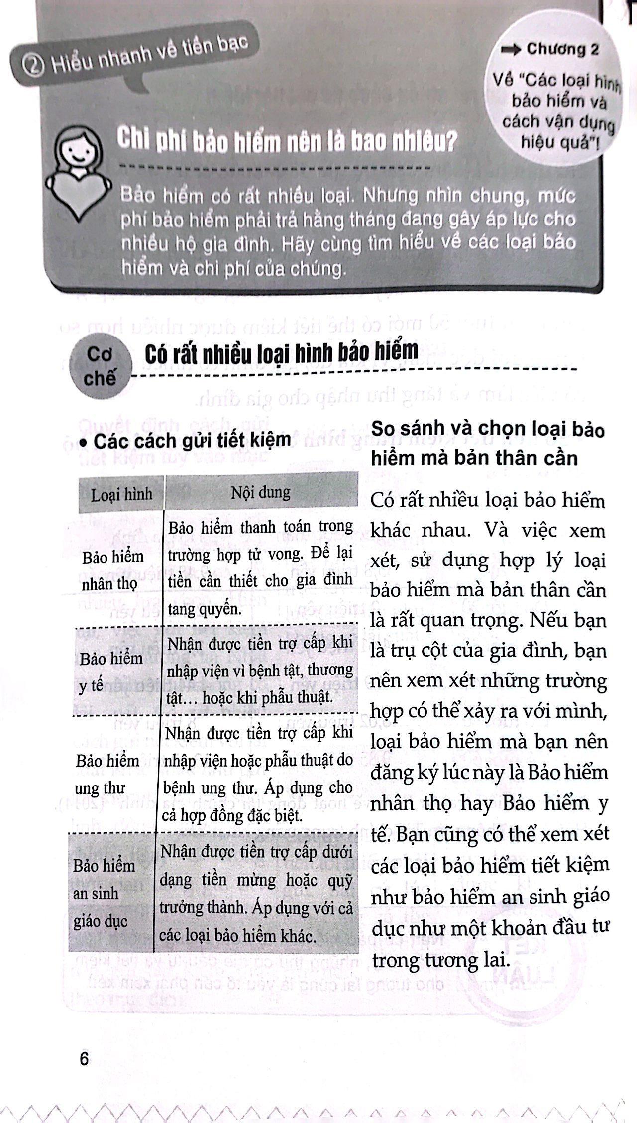 Phương Pháp Quản Lý Chi Tiêu Đơn Giản Và Hiệu Quả “Đây không phải là thời đại mà lương sẽ tăng liên tục theo từng năm”. Đây là điều mà không ai có thể phủ nhận. Dù nhà nước có thực hiện các biện pháp kinh tế như thế nào đi nữa thì nền kinh tế cũng sẽ không tăng lên mà chỉ đủ sức để duy trì. Nó giống như việc đi “thang cuốn lên” vào ngày xưa vậy. Và bây giờ là lúc bạn đi thang cuốn xuống. Nếu cứ để nguyên như vậy thì cuộc sống sinh hoạt của bạn có thể trở nên tồi tệ hơn. Nói một cách chính xác, khoảng cách giữa những người có tiền và những người không có tiền sẽ ngày càng lớn. Thực tế đáng buồn là không nhiều người có thể hoạch định tương lai tài chính của m.ình một cách đúng đắn. Vì sao? Vì bạn chưa có dự định để làm điều đó. Vì bạn không biết phải làm như thế nào. Và vì kiến thức về tiền bạc của bạn không đủ để có thể lập nên một kế hoạch sử dụng tiền hoàn hảo. Nói cách khác, chỉ cần có “kiến thức về tiền bạc” là có thể chống lại thời kỳ suy thoái này. Bạn có thể bị chùn bước khi nghe cụm “kiến thức về tiền bạc”. Tuy nhiên, nếu đối mặt đúng cách thì cũng không quá khó khăn. Cuốn sách này mô tả một cách dễ hiểu về định hướng sử dụng tiền đúng đắn với tiêu chí “những người có thu nhập cao không nhất thiết phải tiết kiệm nhiều”. Mỗi chương của cuốn sách sẽ là chìa khóa giải mã bí quyết cân bằng chi tiêu và tiết kiệm: từ bảo hiểm, quản lý tài sản, cơ chế cho vay, thuế, cho đến tiền chi cho hôn nhân, nuôi con, chăm sóc, thừa kế cha mẹ, tiền về già… Được biên soạn dưới góc nhìn của một chuyên gia về tiền bạc cùng hình minh họa sinh động, cuốn sách chính là cơ hội để bạn có những bước đi đầu tiên cho tương lai tươi sáng của m.ình. Hãy nắm bắt cơ hội đó ngay bây giờ!