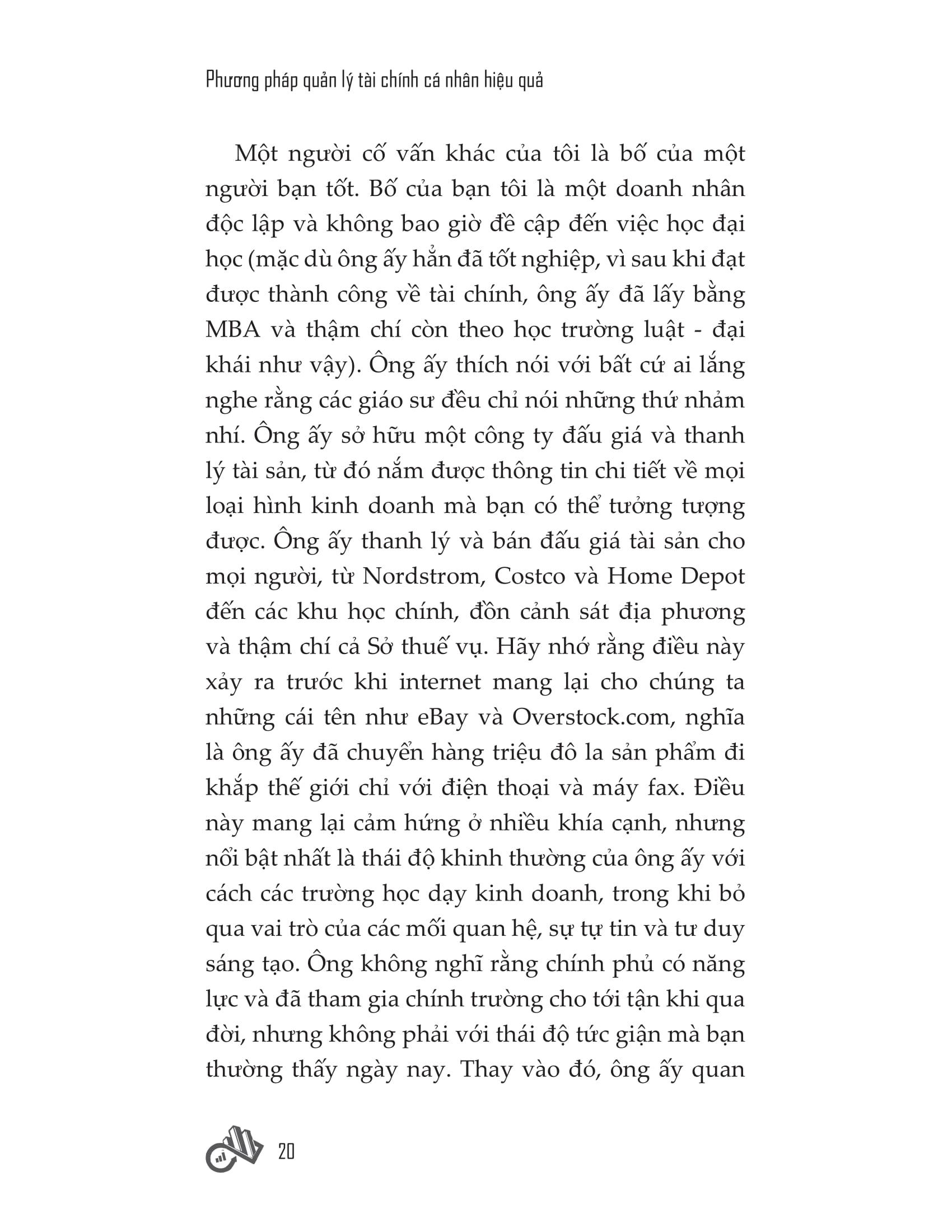 Các chương trong cuốn sách này được sắp xếp để bạn có một hướng tiếp cận rành mạch. Chương 1 giúp bạn hiểu tự do tài chính có ý nghĩa như thế nào. Chương 2 mô tả những điều sẽ xảy ra khi con người bị phụ thuộc về mặt tài chính, cụ thể là cảm giác bất lực không lối thoát dù bạn đã nỗ lực làm việc không ngưng nghỉ. Thực tế là, rất nhiều tổ chức tài chính đang hạn chế quyền tự do của bạn và tận dụng tiền của bạn cho lợi ích của họ. Trong Chương 3, chúng ta sẽ xem xét sự khác biệt hàng đầu giữa người giàu và người nghèo, qua đó xác định tư duy đúng đắn cần theo đuổi để trở nên độc lập về tài chính.