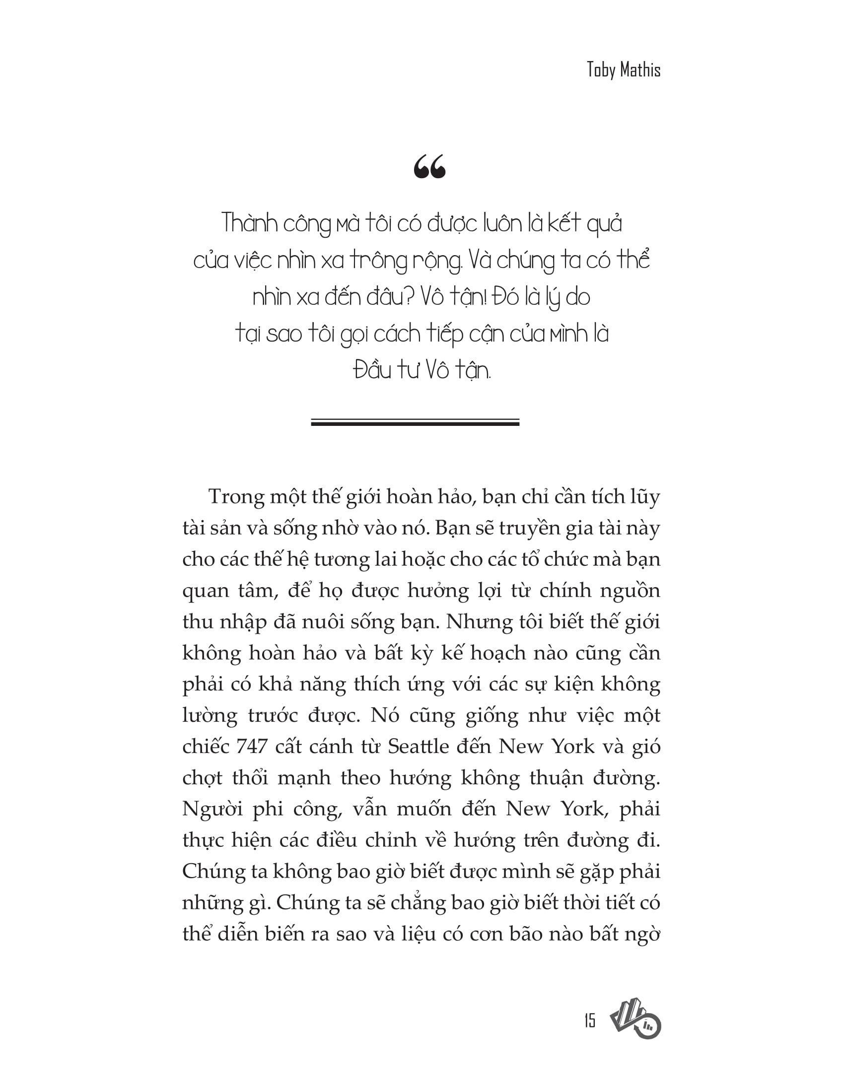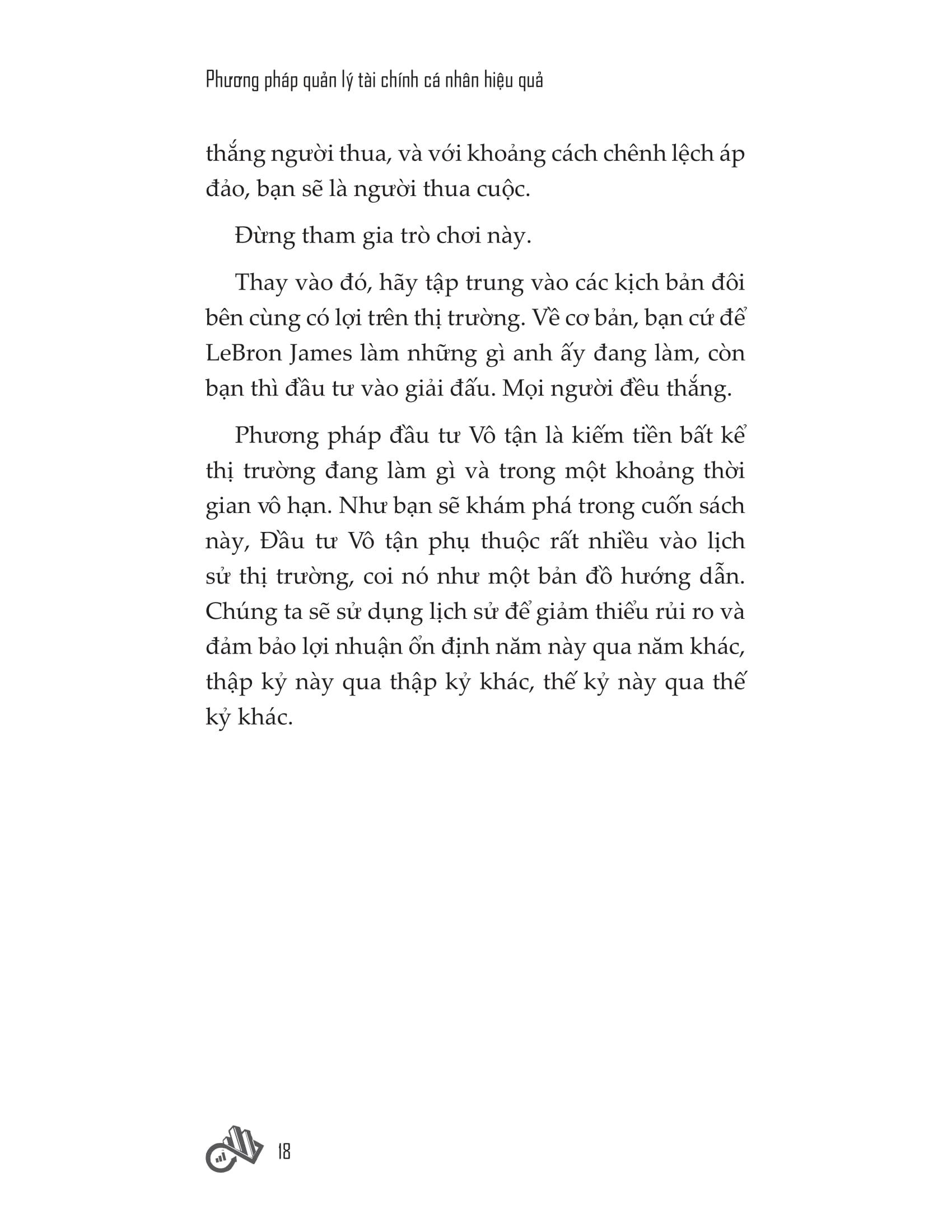 Chiến lược Đầu tư Vô tận trong cuốn sách này giúp bạn kiếm tiền bất kể thị trường diễn biến ra sao, và bạn làm được như vậy trong một khoảng thời gian vô hạn. Đây là một kế hoạch dựa rất nhiều vào lịch sử thị trường và những việc làm thực tế mà nhóm người giàu có đã thực hiện. Chúng ta sẽ sử dụng tất cả những kinh nghiệm này để giảm thiểu rủi ro và đảm bảo lợi nhuận ổn định năm này qua năm khác, thập kỷ này qua thập kỷ khác, và thế kỷ này qua thế kỷ khác.