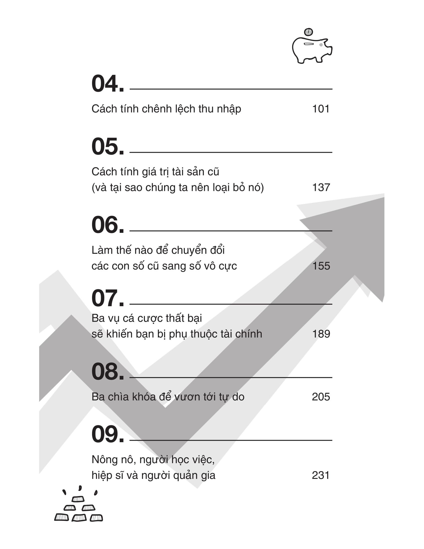 Từ Chương 4 đến Chương 6, bạn sẽ học cách tính toán chênh lệch thu nhập, sau đó chuyển đổi các số liệu để hoạch địch Kế hoạch Vô tận. Chương 7 và 8 xác định ba sai lầm về tài chính khiến bạn bị bó buộc và sau đó, ta cùng xem xét mọi người đang làm gì để thoát ra. Chúng ta sẽ thảo luận về ba điều mọi người đang làm để thành công. Nếu làm những gì những người này đang làm, bạn sẽ thuộc cùng một nhóm với họ.