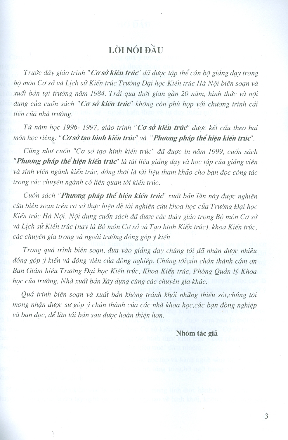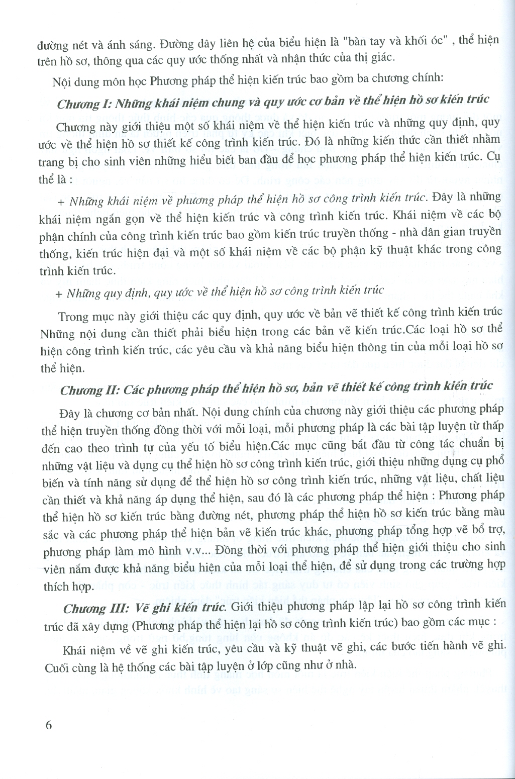 Cuốn sách “Phương pháp thể hiện kiến trúc” xuất bản lần này được nghiên cứu biên soạn trên cơ sở thực hiện đề tài nghiên cứu khoa học của Trường Đại học Kiến trúc Hà Nội. Nội dung cuốn sách đã được các thày giáo trong Bộ môn Cơ số và Lịch sử Kiến trúc (nay là Bộ môn Cơ sở và Tạo hình Kiến trúc), khoa Kiến trúc, các chuyên gia trong và ngoài trường đóng góp ý kiến.