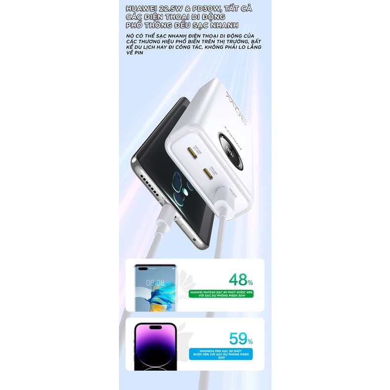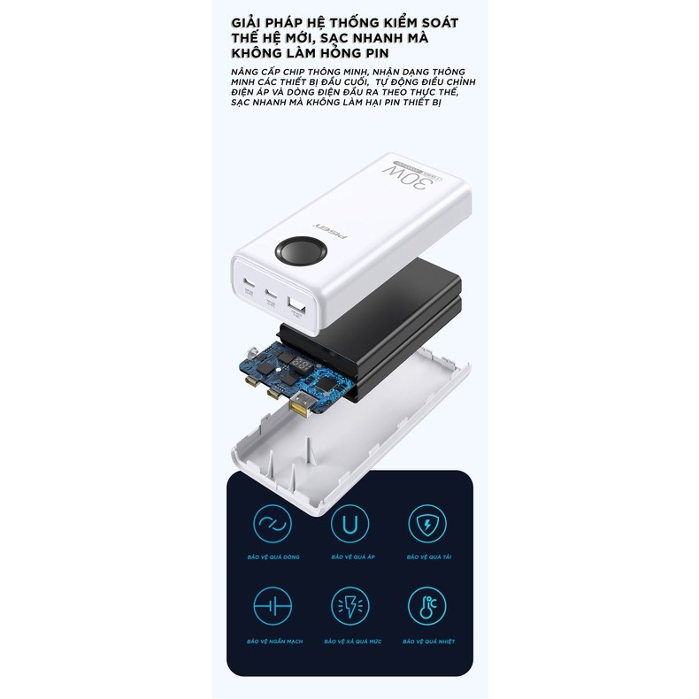 Sạc dự phòng dung lượng lớn 20000mAh, hỗ trợ đa giao thức sạc nhanh, phù hợp với 99% các thiết bị thông minh trên thị trường với công suất sạc ra tối đa 30W. Sạc được trang bị IC thông minh, tự điều chỉnh dòng điện, sạc nhanh an toàn, không hại pin, bảo vệ thiết bị hiệu quả.