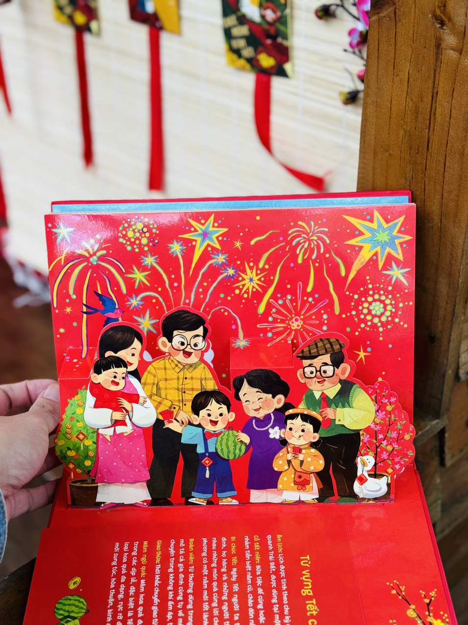 Với các hình ảnh minh hoạ rực rỡ được dựng pop up sinh động cùng phần thiết kế riêng để phụ huynh có thể tương tác với con em mình, cuốn sách về ngày Tết cổ truyền này sẽ giúp trẻ em thì làm quen, người lớn thấy sao nhớ quá, xúc động quá.