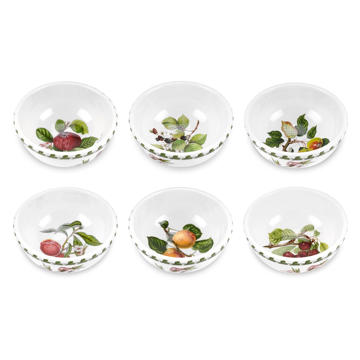 Bộ sáu chiếc Bát Pomona 5,5 inch/14cm này có hoa văn hình minh họa thực vật đẹp mắt. Mỗi bát trưng bày một họa tiết trái cây khác nhau: Táo, Cherry, Blackberry, Lê, Mơ và