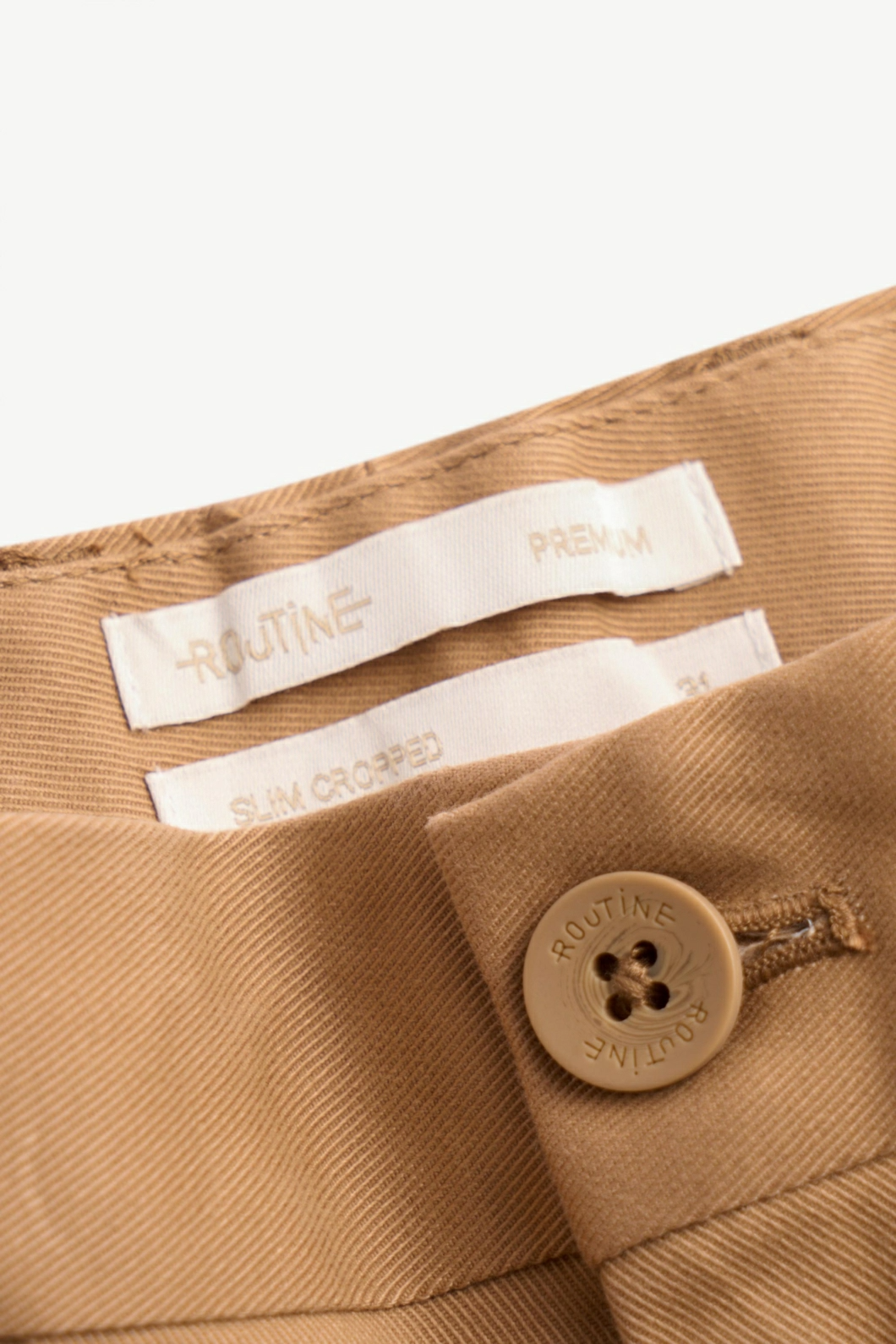 Quần kaki nam đính nhãn kim loại Form Slim cropped - RT 10S25PCA002 | ROUTINE CÀ MAU Đặc điểm nổi bật Form : Slim cropped Fabric : Cotton Spandex Gender: Nam Collection: Essential 25 Sản