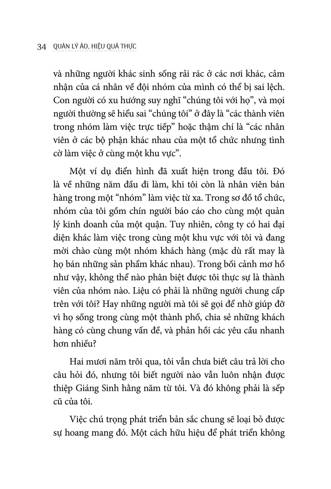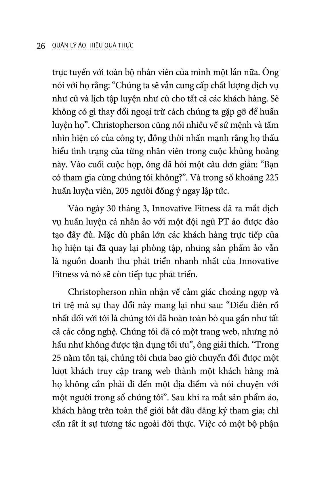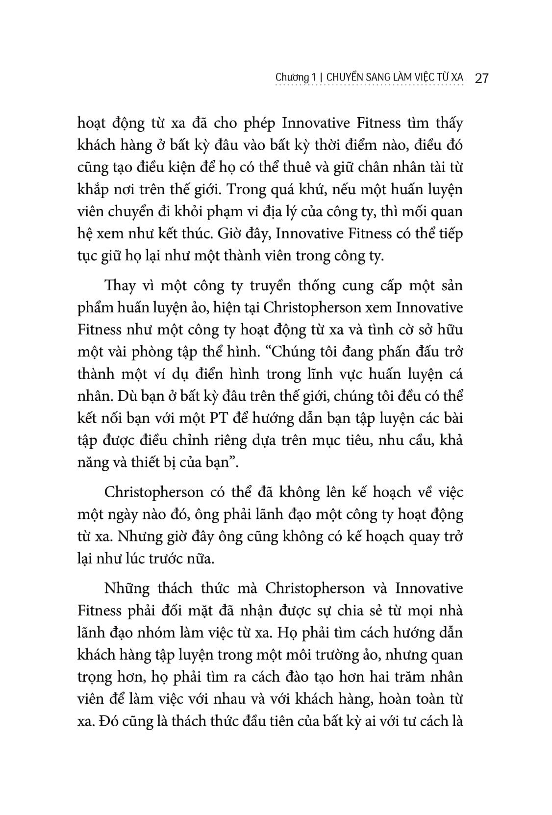 QUẢN LÝ ẢO, HIỆU QUẢ THỰC Hướng dẫn cần thiết để quản lý nhóm từ xa Có phải làm việc tại văn phòng luôn mang đến hiệu quả tốt? Hãy hỏi bất kỳ ai trong văn phòng công ty xem họ đi đâu khi họ “thực sự” cần hoàn thành công việc, và họ sẽ hiếm khi nào đề cập đến văn phòng làm việc của mình – đặc biệt nếu đó là một trong những văn phòng mở, nơi bàn làm việc của họ thực sự chỉ là một chỗ ngồi trên một chiếc bàn dài hoặc một góc nhỏ có tường thấp và cửa phòng làm việc thật ra chỉ là một cặp tai nghe chống ồn. Thật kỳ lạ phải không? Chúng ta xây dựng những không gian rộng lớn và xa hoa để mọi người có thể làm việc cùng nhau, chỉ để nhận ra rằng, phần lớn thời gian, việc mọi người tụ họp bên cạnh nhau lại trở thành nguyên nhân gây xao nhãng khi họ cố gắng hoàn thành công việc. Theo các nghiên cứu của những tập đoàn lớn trên thế giới, những người làm việc từ xa và các nhóm làm việc từ xa đem lại hiệu quả cao hơn so với những nhân viên làm việc tại văn phòng, và nếu được quản lý tốt, họ cũng tích cực tham gia vào công việc hơn. Những “sự kiện toàn cầu” trong 2 năm qua và chuỗi phản ứng sau đó sẽ luôn được cả thế giới ghi nhớ vì rất nhiều điều, mà hầu hết đều là thảm kịch. Tuy nhiên, nó cũng có thể được xem là một cú hích cần thiết để phương thức làm việc từ xa có thể trở nên phổ biến. Giờ đây, hầu hết các nhà quản lý đã tự mình trải nghiệm những lợi ích và thách thức của phương thức làm việc này – đa số đều nhận ra rằng phần thưởng mà họ nhận được là nhiều hơn hẳn so với các rủi ro, và sự phát triển của công nghệ sẽ giúp giảm thiểu những rủi ro đó – điều kiện thuận lợi để các tổ chức tiếp tục phương thức làm việc từ xa. Và những điều này sẽ được nêu ra cụ thể trong quyển sách “Quản lý ảo, hiệu quả thực”. Quản lý ảo, hiệu quả thực: Hướng dẫn cần thiết để quản lý nhóm từ xa “Quản lý ảo, hiệu quả thực” là một quyển sách về quá khứ, hiện tại và tương lai của các đội nhóm làm việc từ xa và cách mà bạn có thể phát triển vai trò lãnh đạo của mình trong tương lai sắp đến. Cho dù trận đại dịch đã qua đi và chúng ta đã có thể đến văn phòng đi làm như lúc trước, nhưng không khó để thấy rằng, trong tương lai gần, công việc từ xa sẽ trở nên phổ biến. Hầu hết nhân viên đều có thể làm việc từ xa ở một mức độ nào đó – tự do phân bổ thời gian giữa văn phòng, nhà riêng, quán cà phê và bất cứ nơi nào họ muốn. Một số người có thể cảm thấy mình đang làm việc cho một công ty bị phân tán – một công ty làm việc từ xa nhiều đến mức thậm chí không có văn phòng trụ sở. Sau khi cân nhắc tất cả các nghiên cứu về năng suất và mức độ tham gia của nhân viên, các nhà lãnh đạo nên phát triển một kế hoạch để công việc trở nên linh hoạt hoàn toàn. Nhiều nhân viên sẽ mong muốn được làm việc từ bất cứ đâu; có nghĩa là bạn cần một kế hoạch để lãnh đạo từ bất kỳ nơi nào. Quyển sách Leading from Anywhere: The Essential Guide to Managing Remote Teams này chính là kế hoạch đó. David Burkus cung cấp cho bạn những thông tin, ý tưởng, công cụ, chiến thuật và kỹ thuật cụ thể để dẫn dắt các nhóm làm việc từ xa. Trong các trang tiếp theo, chúng tôi sẽ trình bày đầy đủ những điều mà các nhà lãnh đạo cần biết về cách làm việc nhóm trong thời đại làm việc từ xa. Và chúng tôi cũng sẽ đưa ra nghiên cứu về một vòng đời hoàn chỉnh của một đội nhóm làm việc từ xa. “Quản lý ảo, hiệu quả thực” sẽ bổ sung vào những gì bạn cần để tồn tại và phát triển với tư cách là nhân viên cho đến cả nhà lãnh đạo của một đội nhóm từ xa – điều mà tất cả các nhà lãnh đạo sẽ cần phải tự cân nhắc kể từ bây giờ.