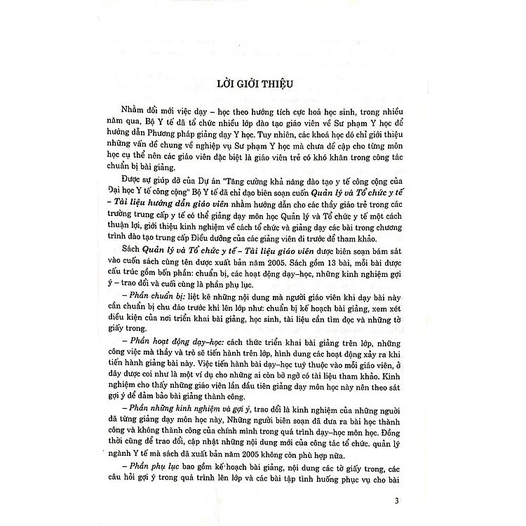 Được sự giúp đỡ của Dự án "Tăng cường khả năng đào tạo y tế công cộng của Đại học Y tế công cộng" Bộ Y tế đã chỉ đạo biên soạn cuốn Quản lý và Tổ chức y tế – Tài liệu hướng dẫn giáo viên nhằm hướng dẫn cho các thầy giáo trẻ trong các trường trung cấp y tế có thể giảng dạy môn học Quản lý và Tổ chức y tế một cách thuận lợi, giới thiệu kinh nghiệm về cách tổ chức và giảng dạy các bài trong chương trình đào tạo trung cấp Điều dưỡng của các giảng viên đi trước để tham khảo. Sách Quản lý và Tổ chức y tế – Tài liệu giáo viên được biên soạn bám sát vào cuốn sách cùng tên được xuất bản năm 2005.