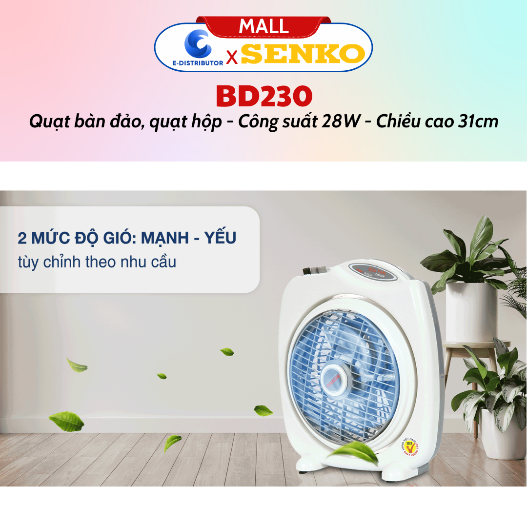 Mua tại TiktokSenko là thương hiệu nổi tiếng trong ngành đồ gia dụng của Việt Nam, nổi lên như một thương hiệu mang lại uy tín về chất lượng, kỹ thuật và độ an toàn cao của sản phẩm. Quạt bàn đảo Senko BD230 (hay gọi là quạt hộp) kiểu dáng sang trọng,hiện đại với thiết kế nhỏ gọn thích hợp để trên giường hay trên bàn đều được, đây cũng là một giải pháp hợp lý để xua tan đi cái nóng của những ngày hè sắp tới, bây giờ chúng ta sẽ đến với những thông tin chi tiết về sản phẩm này nhé. Quạt bàn đảo Senko BD230 là dòng quạt làm mát cho gia đình với thiết kế nhỏ gọn hài hòa và màu sắc trang nhã có thể đặt ở nhiều vị trí khác nhau trong nhà như phòng ăn, phòng khách, phòng ngủ, phòng làm việc đều được. Với công suất 28W và số vòng quay ở tốc độ cao lên đến 1200 vòng/phút, quạt Senko BD230 sẽ cung cấp đủ lượng gió cần thiết giúp cho bạn và gia đình có một không gian thoáng mát để tụ họp gia đình vào ngày hè nóng bức hay sau một ngày làm việc mệt mỏi. Nhỏ gọn sang trọng là điều đầu tiên bạn cảm nhận được khi thấy chiếc quạt hộp Senko này, có nhiều màu sắc để bạn lựa chọn, chiếc quạt này thích hợp với nhiều không gian sống, nhưng thích hợp nhất vẫn là không gian nhỏ hẹp, bạn có thể để quạt ở trên giường học trên bàn… miễn sao bạn cảm thấy thuận tiện và mang lại hiệu quả sử dụng cao nhất. Quạt bàn đảo Senko BD230 được cấu tạo chủ yếu từ chất liệu nhựa ABS chịu lực tốt, chắc chắn, bền bỉ với thời gian, cánh quạt có thiết kế 5 cánh với đường kích 20cm cùng với 2 mức độ điều chỉnh tốc độ gió giúp bạn dễ dàng lựa chọn mức gió phù hợp. Đặc biệt với thiết kế nắp lồng quạt xoay, nguồn gió không chỉ cung cấp đủ mà còn lan tỏa khắp các ngóc ngách trong phòng. Quạt bàn đảo Senko BD230 có ưu điểm là chức năng tạo ra làn gió mát mô phỏng gió tự nhiên tạo cảm giác mát mẽ dễ chịu cho mọi người trong những ngày hè oi bức. Với thiết kế sang trọng, đẹp mắt, màu sắc tươi sáng, mạnh mẽ phù hợp với kiến trúc hiện đại ngày nay, quạt hộp Senko BD230 sẽ làm đẹp hơn, phong phú hơn cho không gian sống của gia đình bạn. THÔNG SỐ CHI TIẾT Tên sản phẩm Quạt Bàn Đảo SENKO BD230 Model BD230 Thương hiệu Senko Công suất 28 W chức năng Có chức năng làm mát Đường kính cánh quạt 20 cm Số cánh quạt 5 cánh Chất liệu cánh quạt Nhựa Bảng điều khiển Nút nhấn Tốc độ gió 2mức Kích thước thùng Ngang 28.3 cm - Cao 31.5 cm - Sâu 14 cm Bảo hành 12 tháng chính hãng