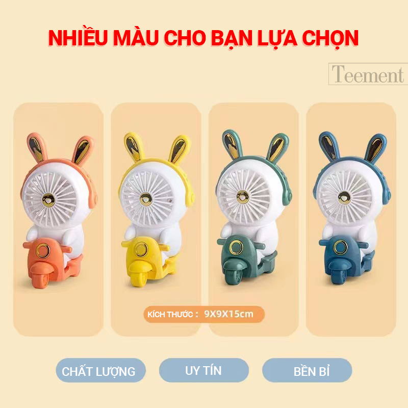 - Quạt cầm tay mini tích điện teement, có kích thước nhỏ và vô cùng tiện dụng, được sử dụng vào những ngày nóng bức. Quạt cầm tay mini có cấu tạo khá giống với quạt cây có cánh quạt và phần lồng quạt. Điểm khác biệt là quạt cầm tay mini chạy bằng pin và có thời lượng sử dụng từ 1 -3 giờ tiếng khi đã được sạc đầy. Với ưu điểm nhỏ gọn và dễ dàng mang đi mọi nơi, nên quạt cầm tay mini đã trở thành vật dụng cần có trong mỗi gia đình.Bộ sản phẩm bao gồm: 01 quạt cầm tay mini + 01 dây cáp sạc USB Chất liệu nhựa ABS an toàn với người sử dụng. Đặc điểm nổi bật Sạc usb di động, sạc bất cứ lúc nào. Mặt lưới trước có thể tháo rời, dễ dàng lau cánh quạt. Thổi gió nhẹ nhàng, không ảnh hưởng công việc. Kích thước quạt : (rộng x dài x cao): 9cm x 9cm x 15cm Với thời gian sạc pin 2 tiếng, quạt có thể hoạt động liên tục trong 1-1.5 tiếng tùy tốc độ vận hành Quạt chạy rất êm, không gây ồn ào làm ảnh hưởng đến mọi người xung quanh Thiết kế thỏ đi xe dễ thương, xinh xắn, kích thước nhỏ gọn, cất vừa trong túi xách, giỏ xách, thuận tiện mang đi du lịch hoặc ra ngoài thời tiết nắng nóng Chân đế cứng cáp có thể đứng vững trên bàn, bề mặt phẳng.