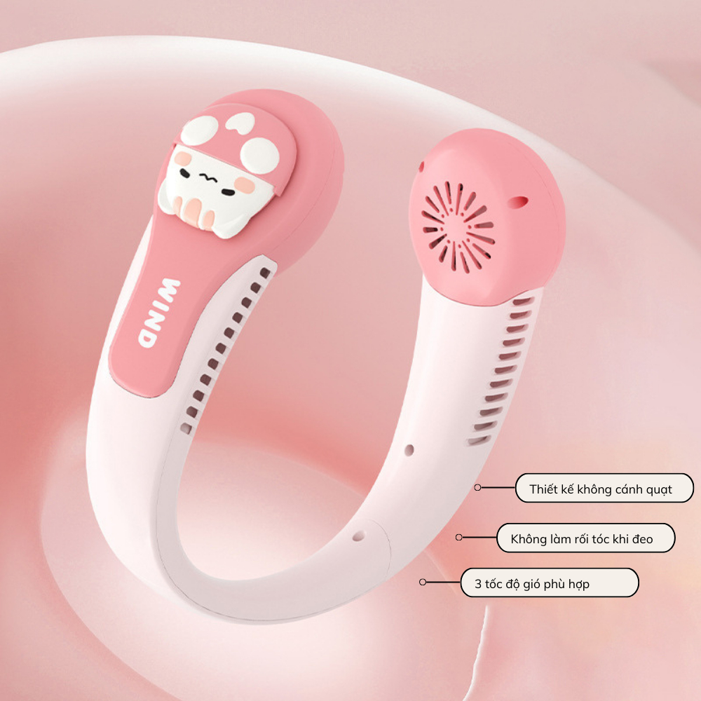 Quạt Đeo Cổ Hình Thú Wind 3D, Quạt Quàng Cổ Không Cánh Mini Cute Sạc Tích Điện USB 3 Cấp Độ Gió