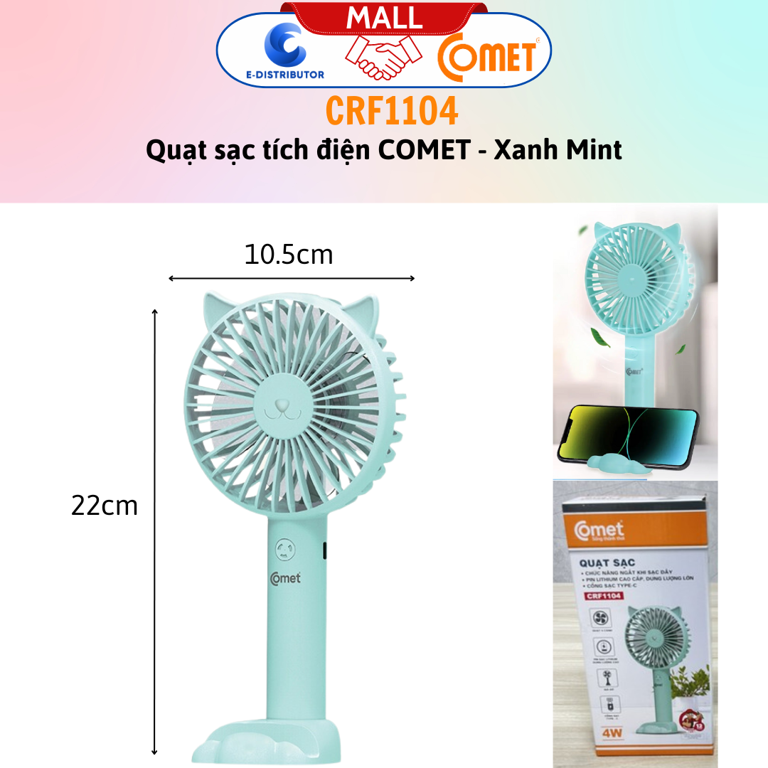 Quạt Sạc Cầm Tay COMET CRF1104 Công Suất 3W, Đế Sạc Rời Thiết kế nhỏ gọn, hiện đại với màu xanh trendy. Quạt Sạc Comet CRF1104 có thiết kế nhỏ gọn, đẹp mắt, có thể mang