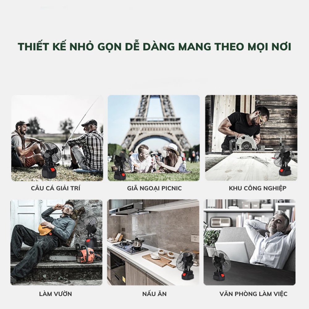 Mua tại TiktokThông Tin Sản Phẩm Chất liệu : thân quạt và cánh bằng sắt sơn tĩnh điện, đế pin bằng nhựa ABS Màu sắc: Màu đen Nguồn điện: 14,4V-21V ( dùng được cho các loại pin trung quốc 88v-99v-118v-168v-199v) Công suất: 22W Trọng lượng quạt: 1,5kg Đường kính quạt 18cm Động cơ 545 18V DC Sản phẩm gồm: 1 thân quạt, 1 củ sạc và 1 pin 10 cell Ưu điểm sản phẩm » Dễ dàng sử dụng, tiện lợi và đáp ứng được nhiều mục đích sử dụng. » Chất liệu bằng kim loại kết hợp sơn tĩnh điện bền đẹp, mang lại giá trị sử dụng dài lâu. » Động cơ to khỏe, chắc chắn, an toàn khi sử dụng » Quạt thiết kế nhỏ gọn