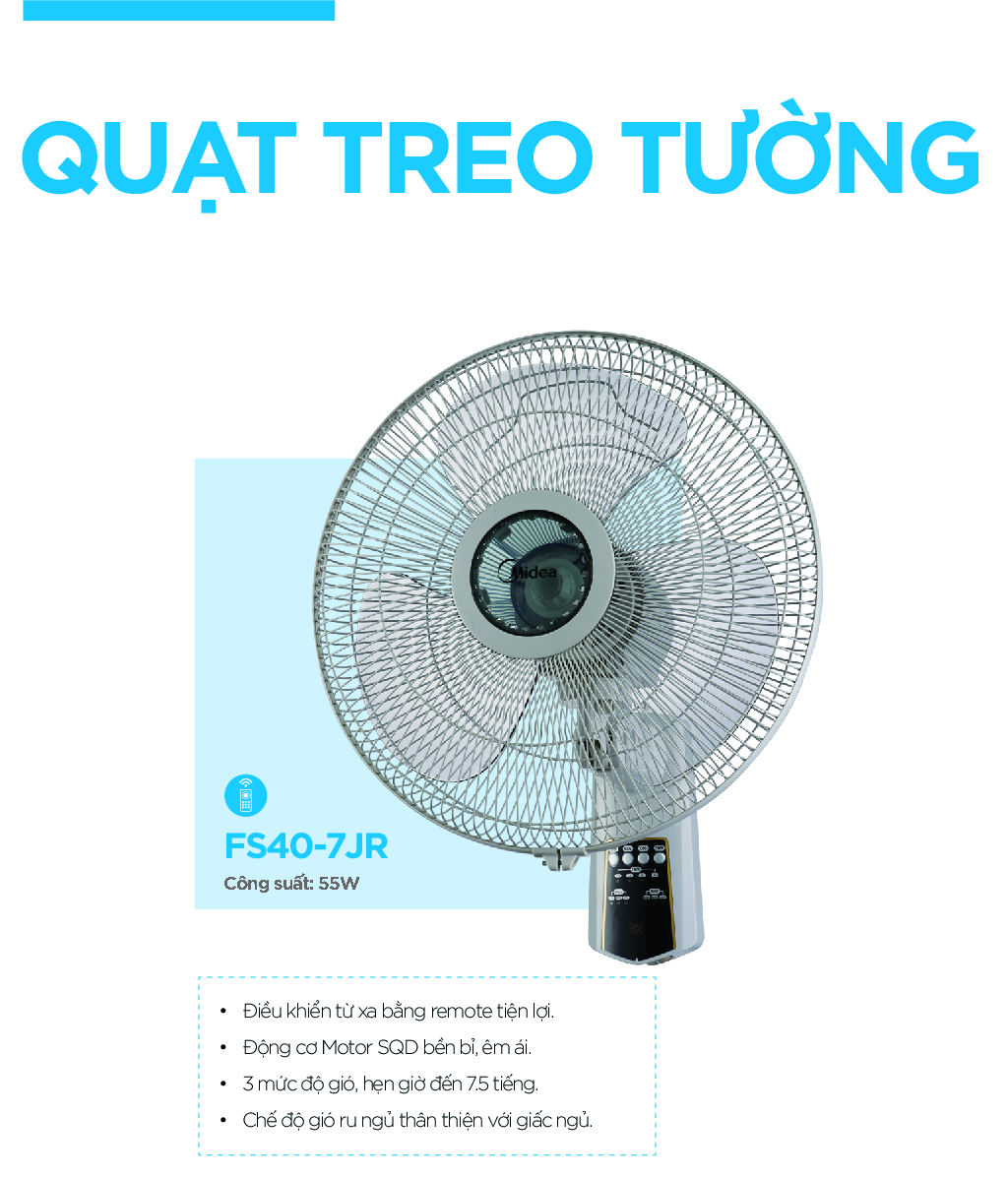 ✨Quạt Treo Tường 3 Cánh Midea FW40-7JR (Quạt Điện Công Suất 55W, Chỉnh Gió 3 Tốc Độ, Có Điều Khiển Từ Xa)