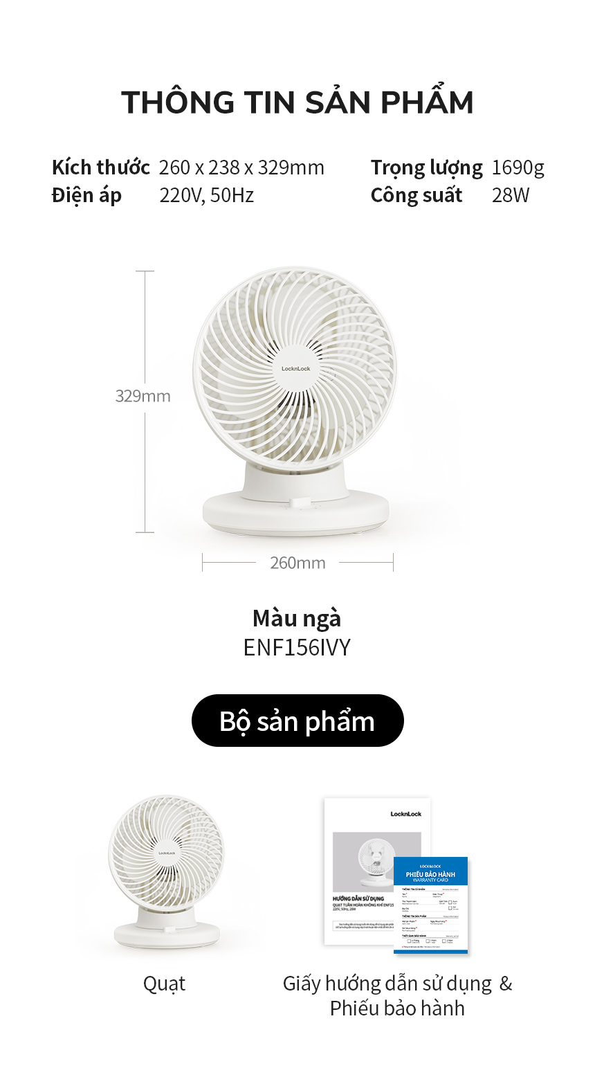 Quạt tuần hoàn không khí LocknLock Bianco ENF156IVY, Hàng chính hãng, để bàn, luồng gió đa chiều - JoyMall THÔNG TIN SẢN PHẨM Thông số: 220V, 50Hz, 28W Chất liệu: Nhựa PP, nhựa ABS Xuất