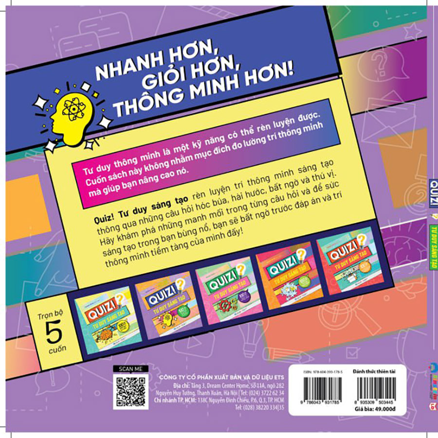 Và Bộ sách Quiz! Tư duy sang tạo không nhằm mục đích đo lường trí thông minh mà giúp bạn nâng cao một trong chín loại trí thông minh của con người. Hy vọng thông qua cuốn sách này, bạn sẽ thông minh hơn và thành công hơn trong cuộc sống.