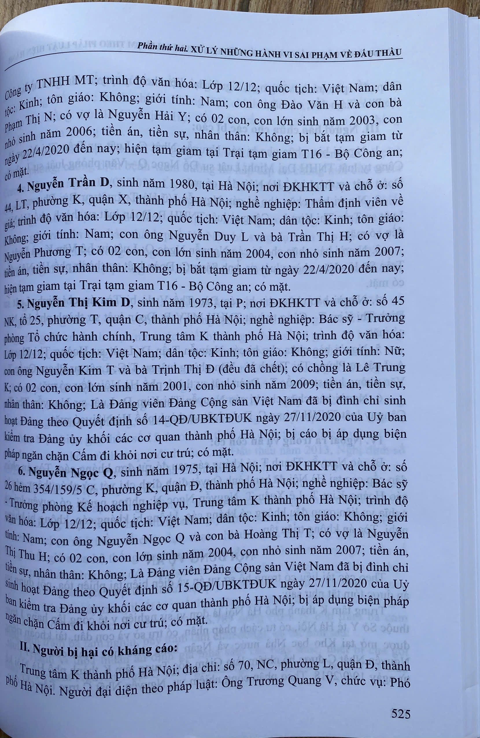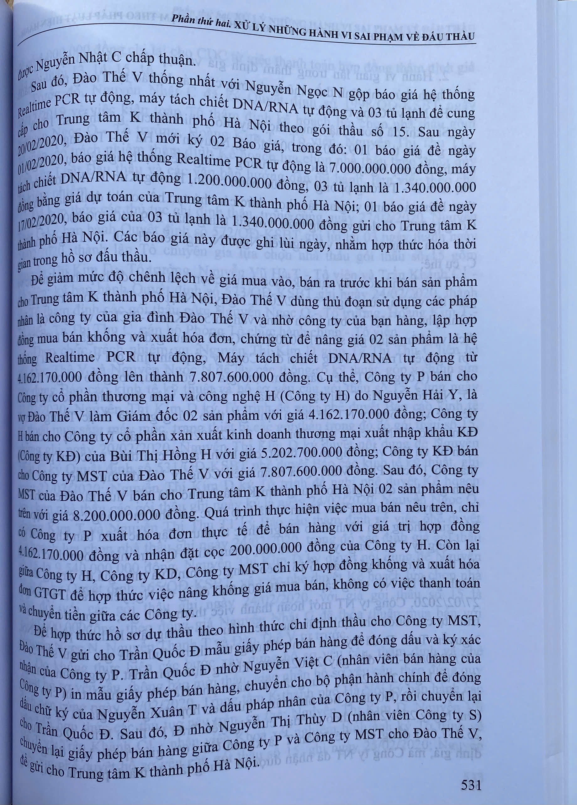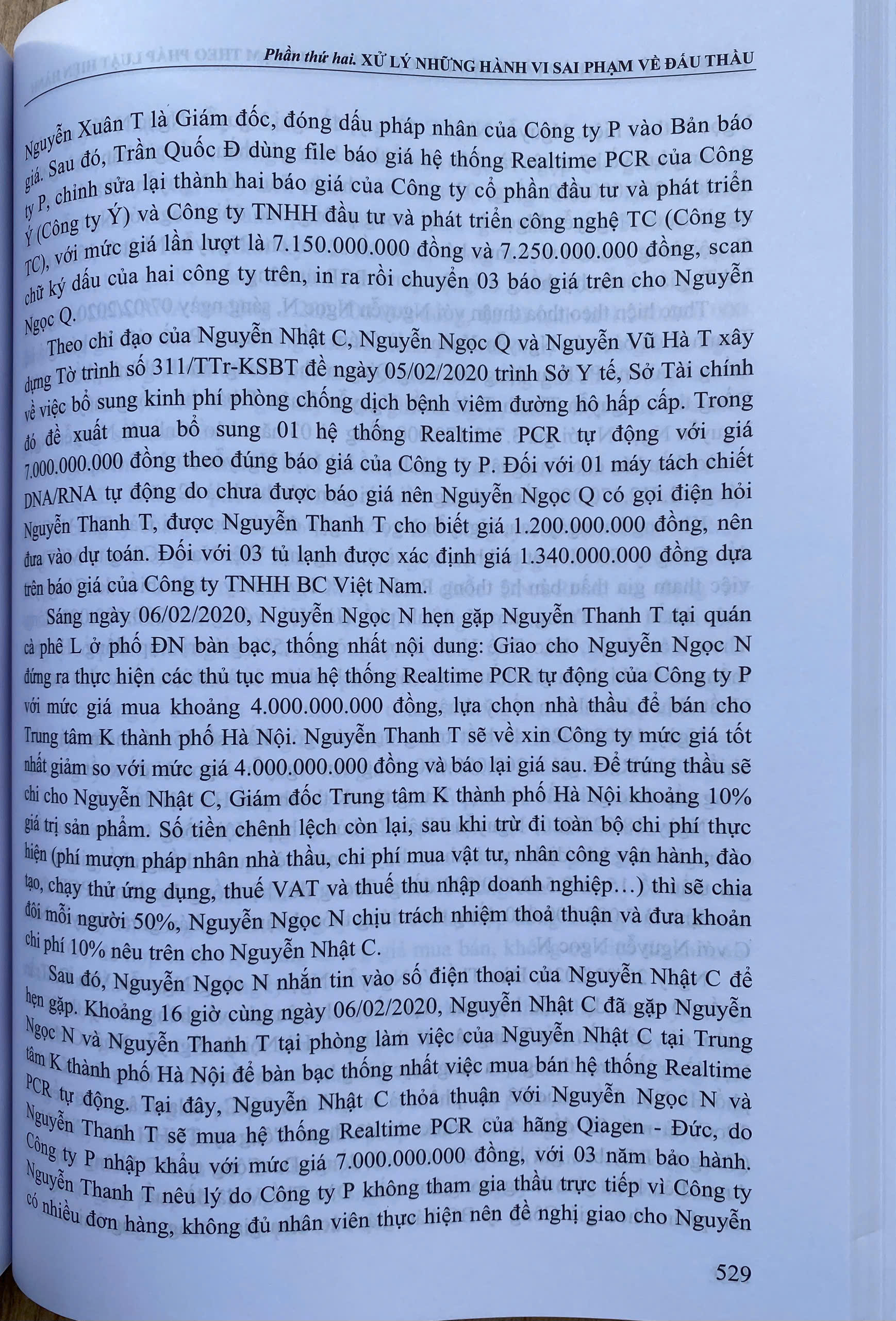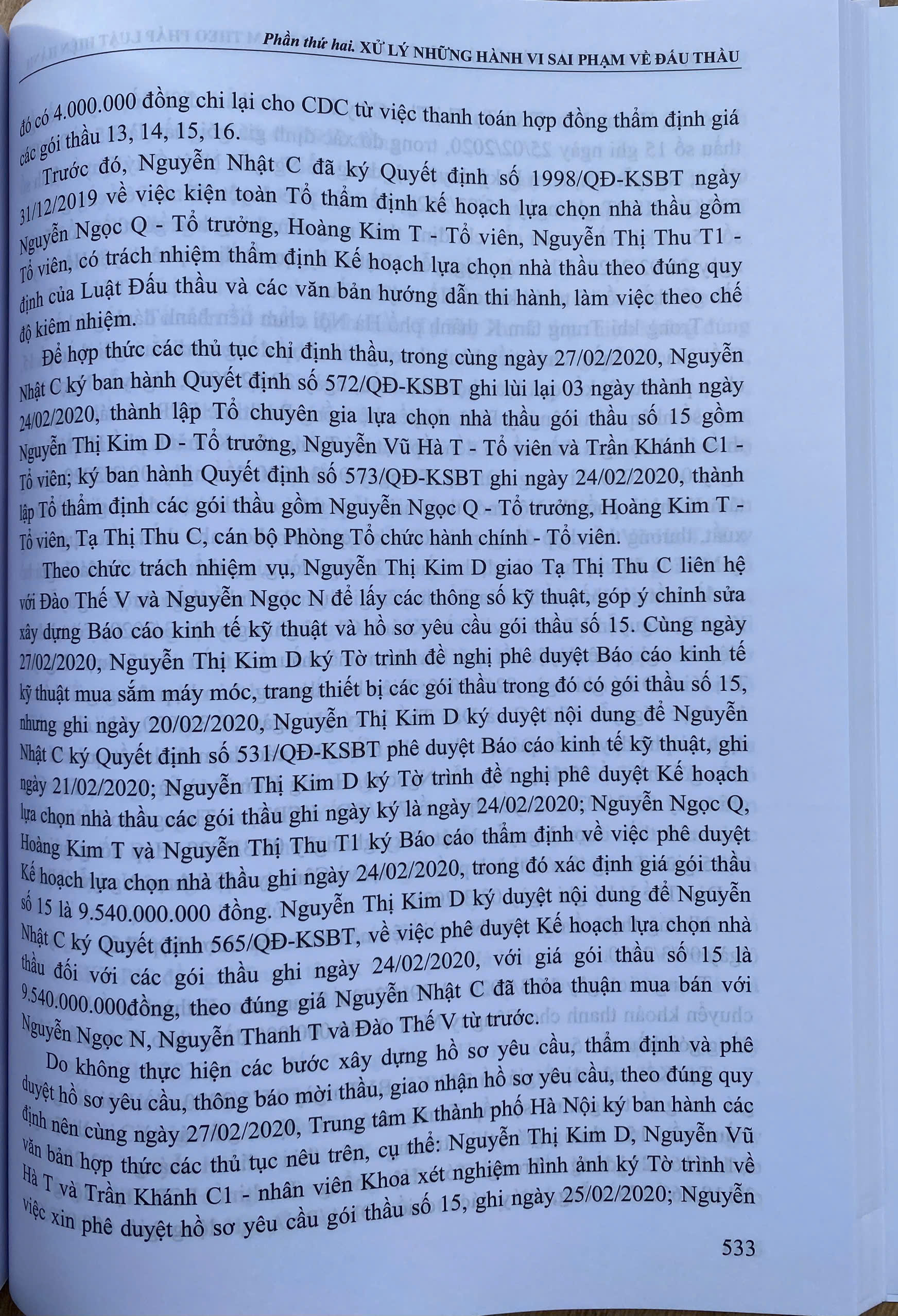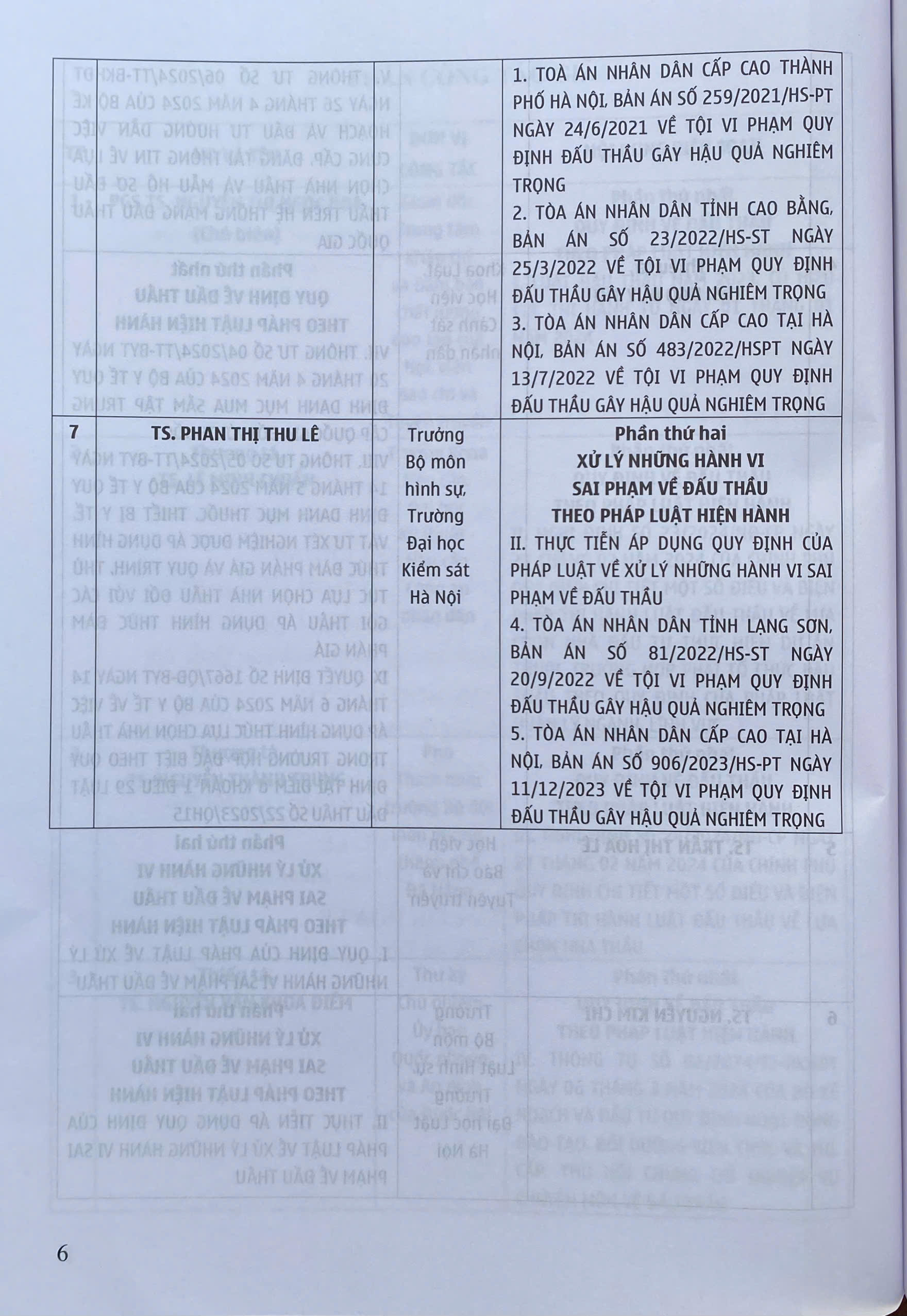 Ngày 23-6-2023 Quốc hội thông qua Luật Đấu thầu số 22/2023/QH15. Theo đó, có 08 đối tượng được hưởng ưu đãi trong lựa chọn nhà thầu, bao gồm: Hàng hóa có xuất xứ Việt Nam; sản phẩm, dịch vụ thân thiện môi trường theo quy định của pháp luật về bảo vệ môi trường; nhà thầu trong nước sản xuất hàng hóa có xuất xứ Việt Nam phù hợp với hồ sơ mời thầu; nhà thầu nước ngoài liên danh với nhà thầu trong nước mà nhà thầu trong nước đảm nhận từ 25% trở lên giá trị công việc của gói thầu; nhà thầu trong nước tham dự thầu với tư cách độc lập hoặc liên danh với nhà thầu trong nước khác khi tham dự đấu thầu quốc tế; nhà thầu là doanh nghiệp siêu nhỏ, doanh nghiệp nhỏ theo quy định của pháp luật về hỗ trợ doanh nghiệp nhỏ và vừa; nhà thầu là doanh nghiệp khởi nghiệp sáng tạo theo quy định của pháp luật; nhà thầu có sử dụng số lượng lao động nữ từ 25% trở lên; số lượng lao động là thương binh, người khuyết tật từ 25% trở lên; số lượng lao động là người dân tộc thiểu số từ 25% trở lên. Luật này có hiệu lực từ ngày 01-01-2024. Nội dung cuốn sách gồm:  Phần I. ĐẤU THẦU THEO PHÁP LUẬT HIỆN HÀNH Luật Đấu thầu năm 2023, có hiệu lực thi hành từ ngày 01 tháng 01 năm 2024 Nghị định số 23/2024/NĐ-CP ngày 27 tháng 02 năm 2024 của Chính phủ quy định chi tiết một số điều và biện pháp thi hành Luật Đấu thầu về lựa chọn nhà đầu tư thực hiện dự án thuộc trường hợp phải tổ chức đấu thầu theo quy định của pháp luật quản lý ngành, lĩnh vực. Nghị định số 24/2024/NĐ-CP ngày 27 tháng 02 năm 2024 của Chính phủ quy định chi tiết một số điều và biện pháp thi hành Luật Đấu thầu về lựa chọn nhà thầu. Thông tư số 02/2024/TT-BKHĐT ngày 06 tháng 3 năm 2024 của Bộ Kế hoạch và đầu tư quy định hoạt động đào tạo, bồi dưỡng kiến thức và thi, cấp, thu hồi chứng chỉ nghiệp vụ chuyên môn về đấu thầu Thông tư số 06/2024/TT-BKHĐT ngày 26 tháng 4 năm 2024 của Bộ Kế hoạch và đầu tư hướng dẫn việc cung cấp, đăng tải thông tin về lựa chọn nhà thầu và mẫu hồ sơ đấu thầu trên hệ thống mạng đấu thầu quốc gia. Thông tư số 03/2024/TT-BYT ngày 16 tháng 4 năm 2024 của Bộ Y tế ban hành danh mục thuốc có ít nhất 03 hãng trong nước sản xuất trên dây chuyền sản xuất thuốc đáp ứng nguyên tắc, tiêu chuẩn EU-GMP hoặc tương đương EU-GMP và đáp ứng tiêu chí kỹ thuật theo quy định của Bộ Y tế và về chất lượng, giá, khả năng cung cấp. Thông tư số 04/2024/TT-BYT ngày 20 tháng 4 năm 2024 của Bộ Y tế quy định danh mục mua sắm tập trung cấp quốc gia đối với thuốc. Thông tư số 05/2024/TT-BYT ngày 14 tháng 5 năm 2024 của Bộ Y tế quy định danh mục thuốc, thiết bị y tế, vật tư xét nghiệm được áp dụng hình thức đàm phán giá và quy trình, thủ tục lựa chọn nhà thầu đối với các gói thầu áp dụng hình thức đàm phán giá. Quyết định số 1667/QĐ-BYT ngày 14 tháng 6 năm 2024 của Bộ Y tế về việc áp dụng hình thức lựa chọn nhà thầu trong trường hợp đặc biệt theo quy định tại điểm đ khoản 1 Điều 29 Luật Đấu thầu số 22/2023/QH15. Phần II. XỬ LÝ NHỮNG HÀNH VI SAI PHẠM VỀ ĐẤU THẦU 1.Quy định của pháp luật về xử lý những hành vi sai phạm về đấu thầu Nghị định số 122/2021/NĐ-CP ngày 28 tháng 12 năm 2021 của Chính phủ quy định về xử phạt vi phạm hành chính trong lĩnh vực kế hoạch và đầu tư. Bộ luật Hình sự năm 2015, được sửa đổi, bổ sung năm 2017. 2. Thực tiễn áp dụng quy định của pháp luật về xử lý những hành vi sai phạm về đấu thầu. Tòà án nhân dân cấp cao thành phố Hà Nội, Bản án số 259/2021/HS-PT ngày 24/6/2021 về tội vi phạm quy định đấu thầu gây hậu quả nghiêm trọng. Tòa án nhân dân tỉnh Cao Bằng, Bản án số 23/2022/HS-ST ngày 25/3/2022 về tội vi phạm quy định đấu thầu gây hậu quả nghiêm trọng. Tòa án nhân dân cấp cao tại Hà Nội, Bản án số 483/2022/HSPT ngày 13/7/2022 về tội vi phạm quy định đấu thầu gây hậu quả nghiêm trọng. Tòa án nhân dân tỉnh Lạng Sơn, Bản án số 81/2022/HS-ST ngày 20/9/2022 về tội vi phạm quy định đấu thầu gây hậu quả nghiêm trọng. Tòa án nhân dân cấp cao tại Hà Nội, Bản án số 906/2023/HS-PT ngày 11/12/2023 về tội vi phạm quy định đấu thầu gây hậu quả nghiêm trọng.